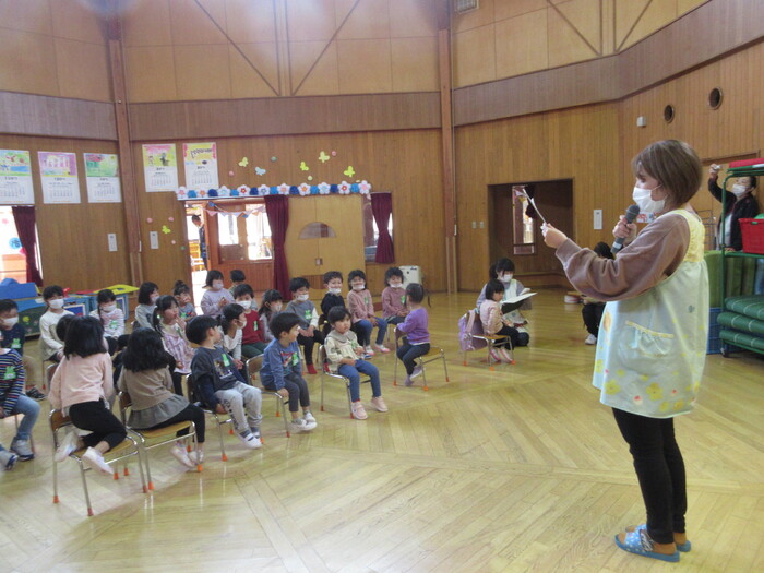 3歳児、4歳児、5歳児クラスの子ども達を対象に、歯磨き指導を行いました。こども園では給食後、歯磨きタイムを設けていています。歯と口の健康週間(6月4日~6月10日)に合わせて、子ども達と一緒に歯磨きの仕方を確認しました。歯ブラシの持ち方や歯磨きの大切さをパネルシアターや大型絵本を見て、「はみがきがんばる!」と約束してくれました。これからも大切な歯を守り、おいしいご飯をたくさん食べられるようにしていきましょうね。 | ||