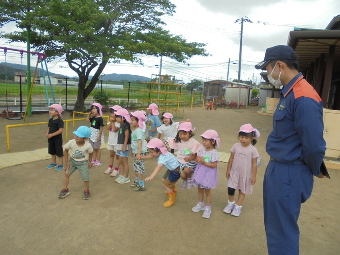 米谷こども園では、毎月1回避難訓練を実施しています。今月は、避難訓練とともに幼年消防クラブ任命式を行いました。 めろん組、ぶどう組の子ども達が消防クラブの法被を着て参加しました。ぶどう組さんは任命証を受け取り、みんなで『防火の誓い』を言い、消防について確認しました。 | ||