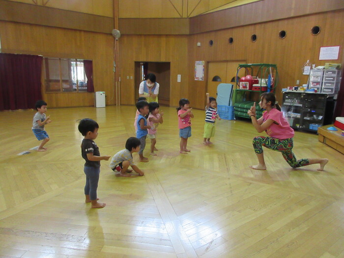 米谷こども園では、講師の先生をお招きして『キッズビート体操教室』を行っています。(年2回) 講師の井波由希先生と一緒に体を動かして楽しみましたよ。音楽に合わせて、走ったり、踊ったり、色々なポーズを決めたりして、元気いっぱいの子ども達でした☆ | ||