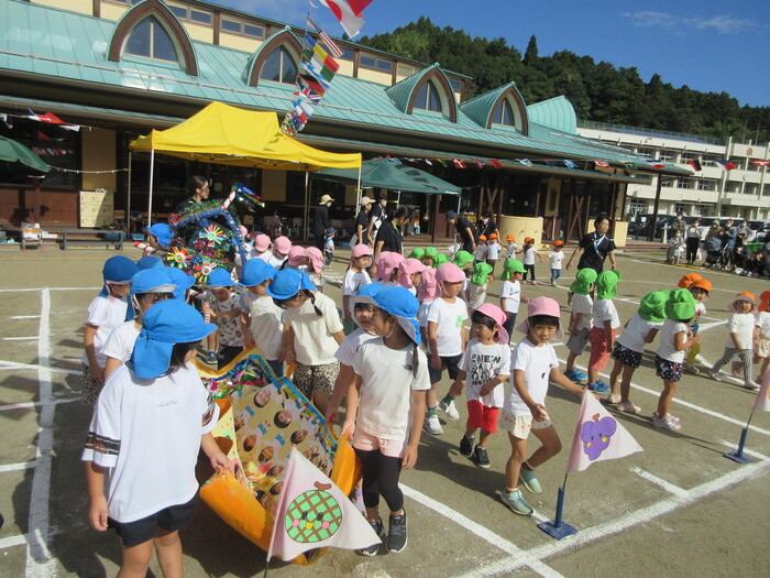 前日の強風はどこへ行ったのか、運動会当日は、秋晴れの気持ちのよい1日になりました。お家の皆様、お忙しい中ご参加いただきありがとうございました。子ども達は朝からニコニコ笑顔で運動会に参加していましたね。元気いっぱいに走る姿、お家の方と一緒に競技を楽しむ姿、踊りやバルーン等練習の成果を発揮した、かっこいい姿等、色々な場面で見られました。みんな頑張りましたね‼子ども達の成長を実感するよい1日になりました☆ | ||