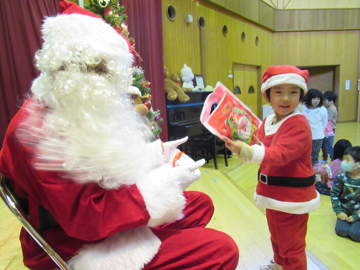 今年も米谷こども園にサンタさんが来てくれました☆先生の出し物の後♪あわてんぼうのサンタクロース♪を歌を歌っていると、どこからか鈴の音が…。ホールにサンタさんが登場すると、大きな歓声があがりました!サンタさんからお手紙を頂き、お楽しみのクリスマスプレゼントも一人一人頂きました。最後に各クラス記念撮影をして、サンタさんは帰っていきました。来年も来てくれるといいですね♪ | ||