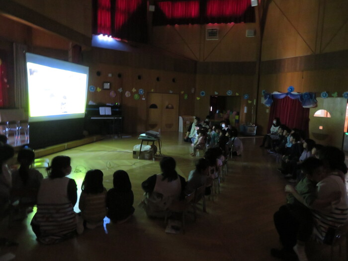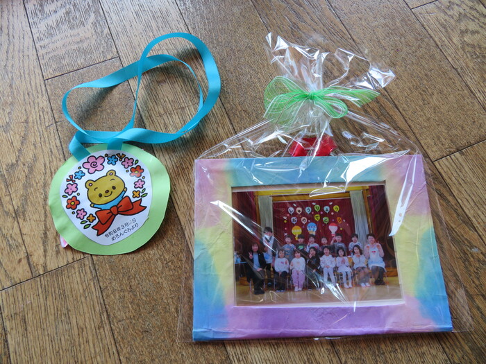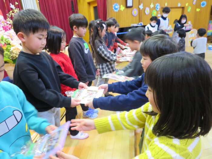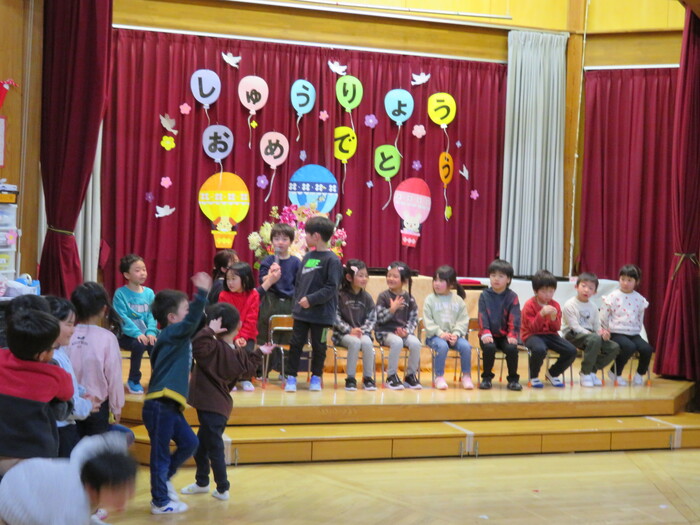 ホールで全クラス合同のお別れ会がありました。小学生になるめろん組は、ステージに並んで椅子に座り、隣ではぶどう組が司会やインタビュー係として張り切ってくれました!!修了式用のスライドショーをみんなで観ると、喜んで歓声を上げていましたよ♬会の終わりに4,5歳児たちが、手作りのペンダントや写真たてをプレゼントし合いました。小学校に行っても元気で過ごしてください。 以上児クラスでは給食をホールで会食形式で行いましたよ、楽しく盛り上がりステキな思い出ができました^^ | ||