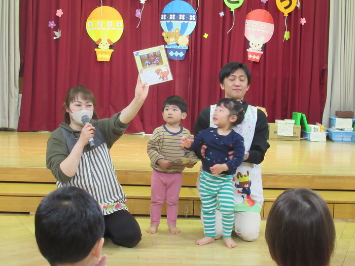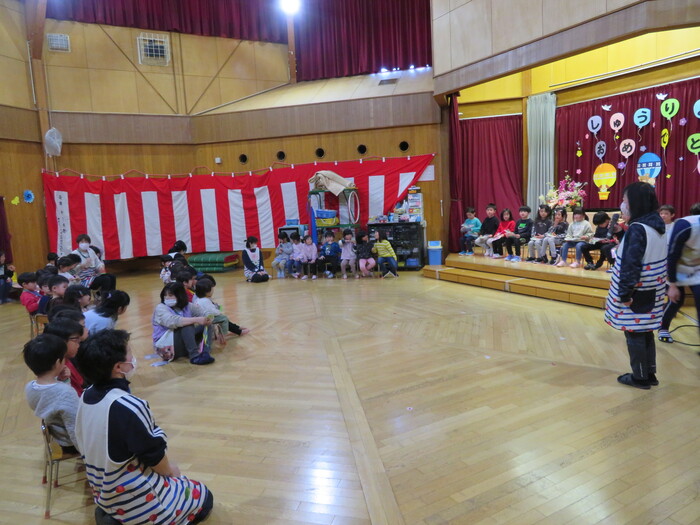 今年の生活発表会も、観覧の人数制限を行わず2部制で行いました。 1部では、0歳児のお友達が汽車に乗ったり、1歳児のお友達はサメになりきって踊ったりと、とても可愛らしい姿を見せてくれました。2歳児のお友達は劇遊びに挑戦!おじいさんや孫や動物になりきり、かぶをひっぱる姿が微笑ましかったですね。 2部では、3歳児クラスから5歳児クラスのお友達がダンスや劇、合唱を披露しました。5歳児クラスはこども園最後の発表会。歌に合奏、ダンス、劇とたくさんの演目に挑戦し、ステキな姿をみせてくれました。 保護者の皆さま、温かいまなざしや盛大な拍手をありがとうございました。これからも表現活動を楽しんでいきたいと思います。 | ||