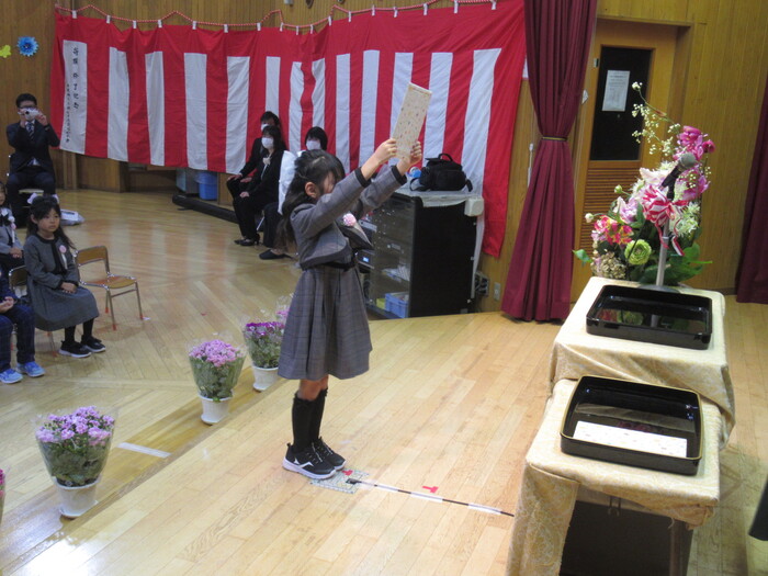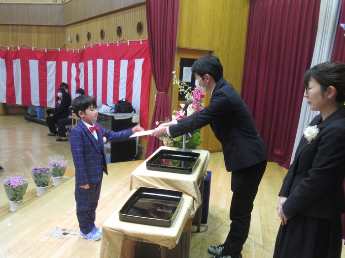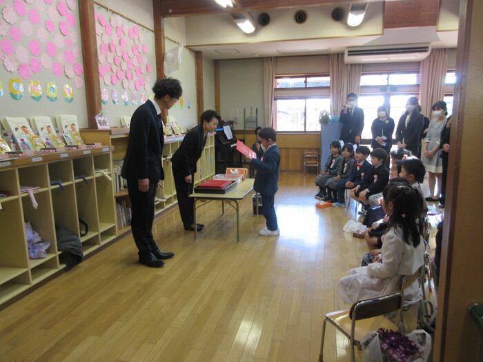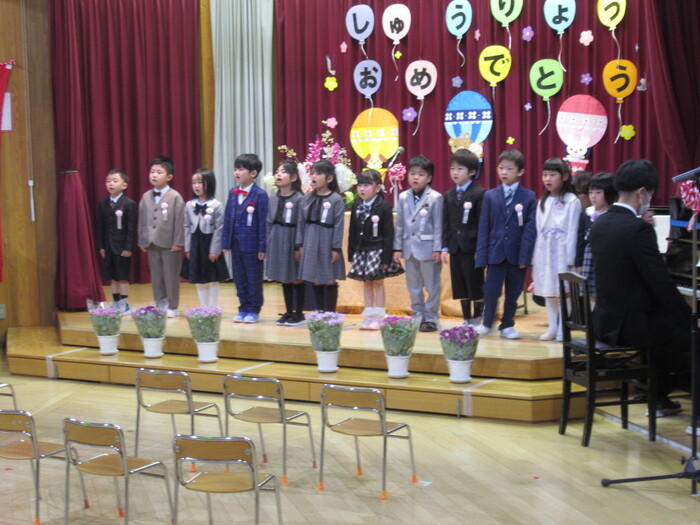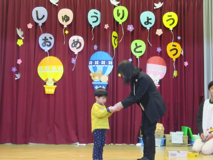 とても良い天気の本日、5歳児めろん組の修了式が行われました。立派に入場して着席し、園長先生から証書を受け取り、お別れの言葉や歌を発表する姿からは、一人一人の成長を感じる事ができました。 小学校に行っても元気いっぱいで、友達と勉強や運動を頑張ってくださいね♬ | ||