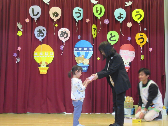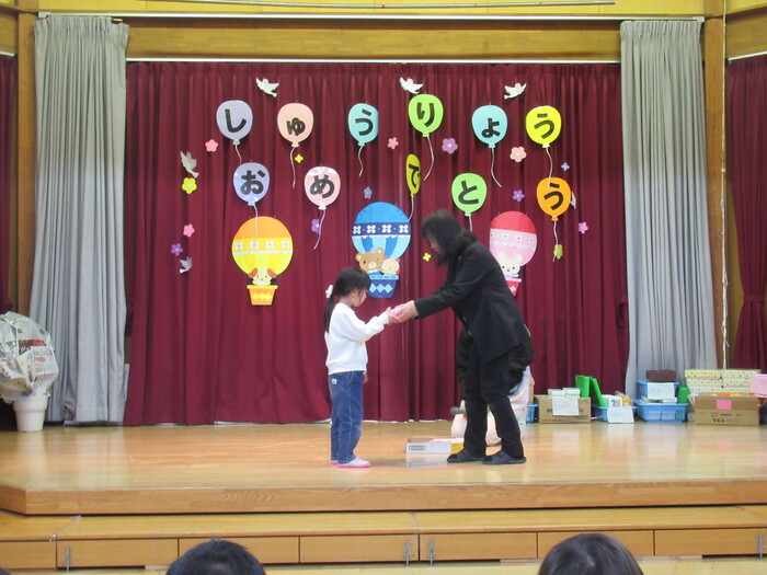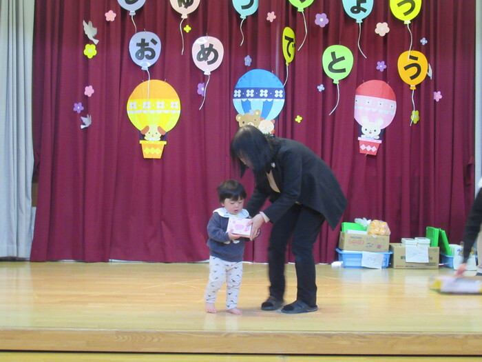 今月でお別れする友達の紹介もあり、みんなでお別れの言葉と一緒にプレゼントも渡しました。 最後はぶどう・ばなな・りんご・いちご・さくらんぼ組から代表一名がステージに上がり、保護者会からの記念品を受け取りました。どうもありがとうございます。自分の可愛い顔写真が入ったペンスタンドです。お家で使ってくださいね。 最後は修礼で上手にお辞儀ができました。来年度も元気で頑張りましょう^^ | ||