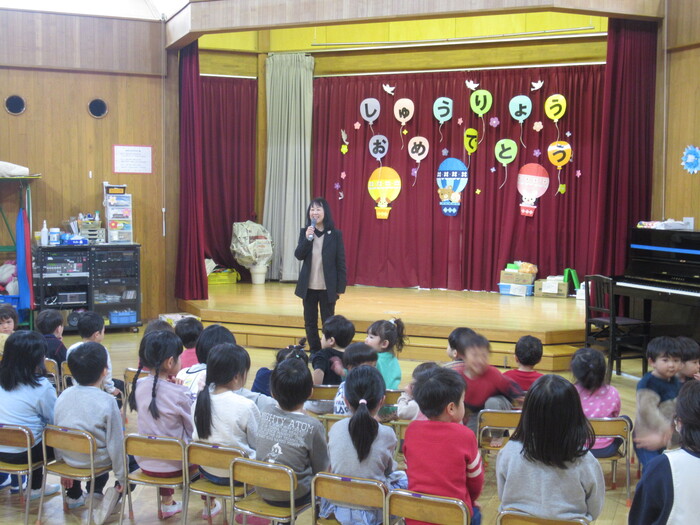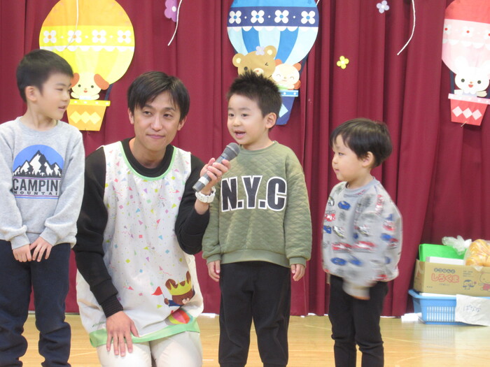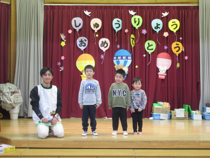 本日は4歳児以下の修了式がホールで行われました。園長先生の話を聞きながら、大きくなったことを喜び合いましたよ。その後はぶどう・ばなな・りんご組から一名ずつが代表でステージに上がり、来年どんなことが楽しいかな?今年はどんなことを頑張ったかな?とそれぞれ質問に答えて発表できました。みんなから応援もされて「がんばります!」と張り切って返事をする子ども達でしたよ。 | ||