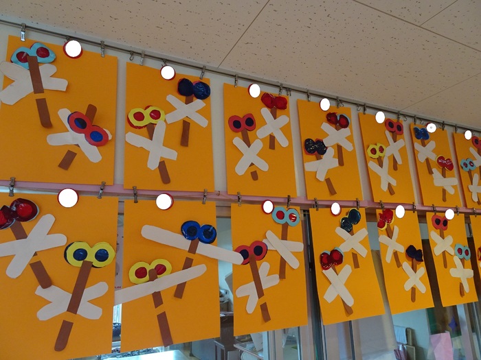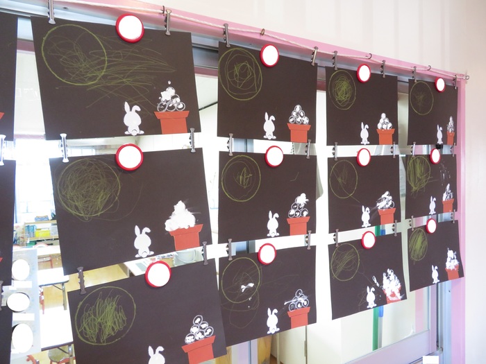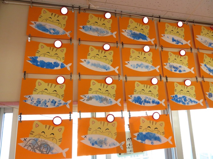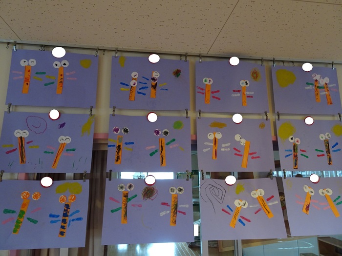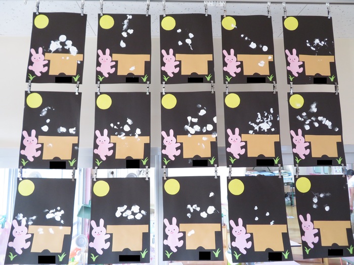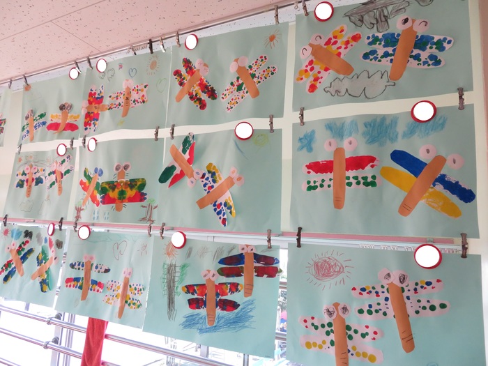 今月も各クラスの制作を紹介したいと思います。朝夕の気温も涼しくなり季節は秋・・・トンボがたくさん飛んでいますね! 今月はお月見やサンマやトンボなど秋にちなんだものを制作しました。各年齢の成長段階に応じで自分の指や道具を使用し作品を仕上げました。個性豊かな作品が大集合です♪ | ||