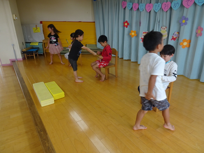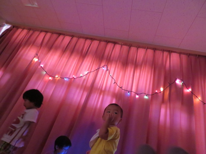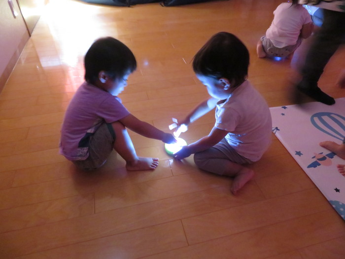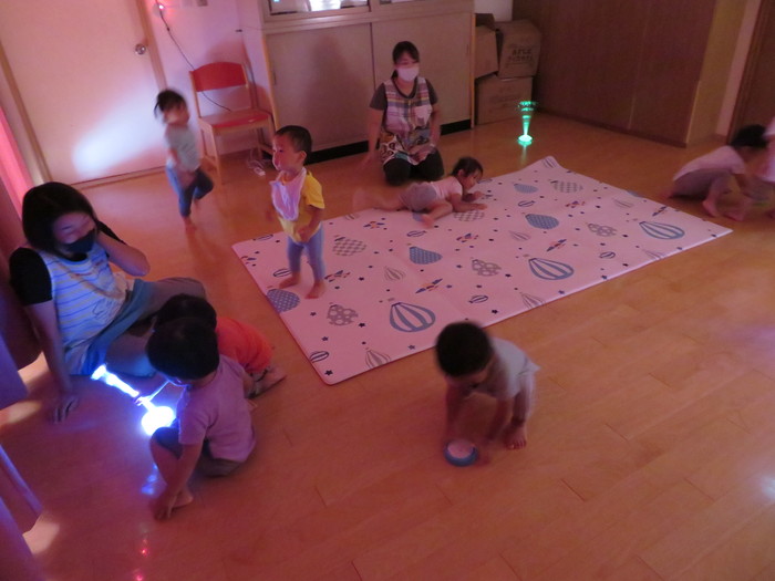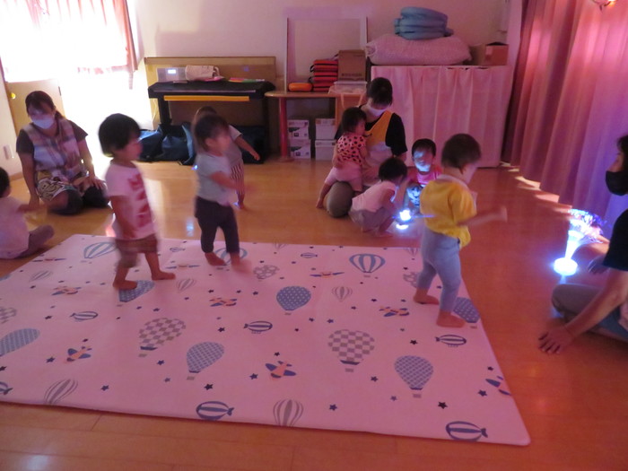 気温が高く暑い日が続いた9月。井戸端ホールにカーテンをし『やわらかい光』と『心地よい曲』を流し癒しの空間を作りました。部屋に入るなり「わぁ~」と言う声と目を真ん丸に開く子どもたち。フワフワのマットに横になったり光を触ったり、、、様々な感覚で癒されていました♪ | ||