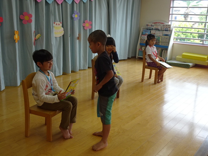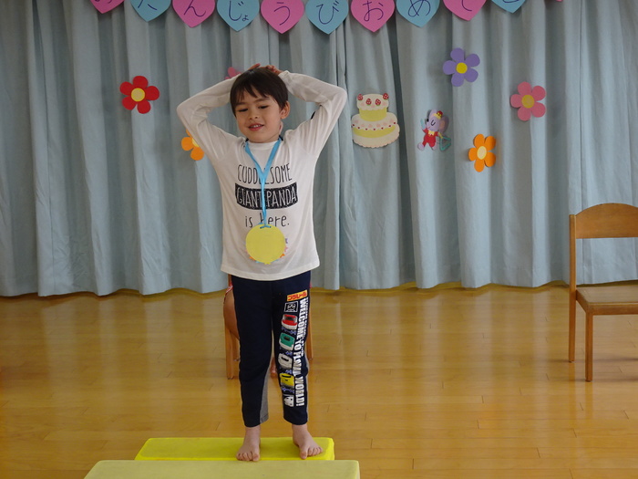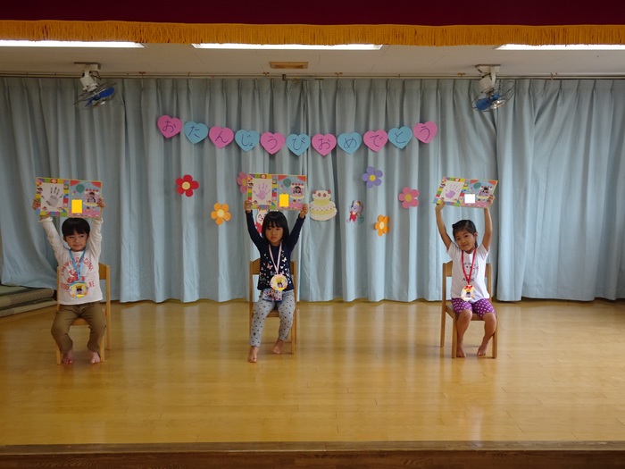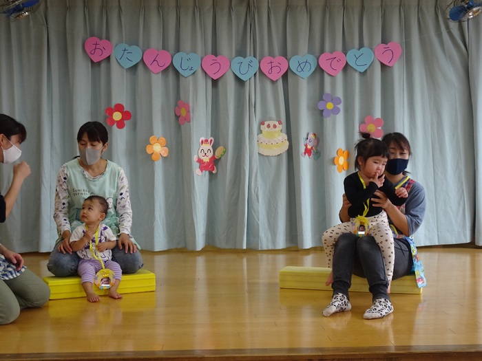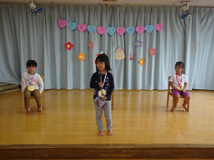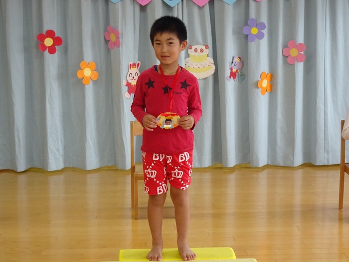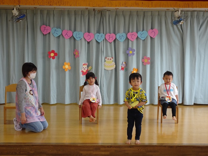 9月生まれの誕生会をしました♫誕生会は1年に1回主役になれる日!前に立つとドキドキしながらも名前を言えました☆ひとつ大きくなったお友だち!おめでとう!! | ||