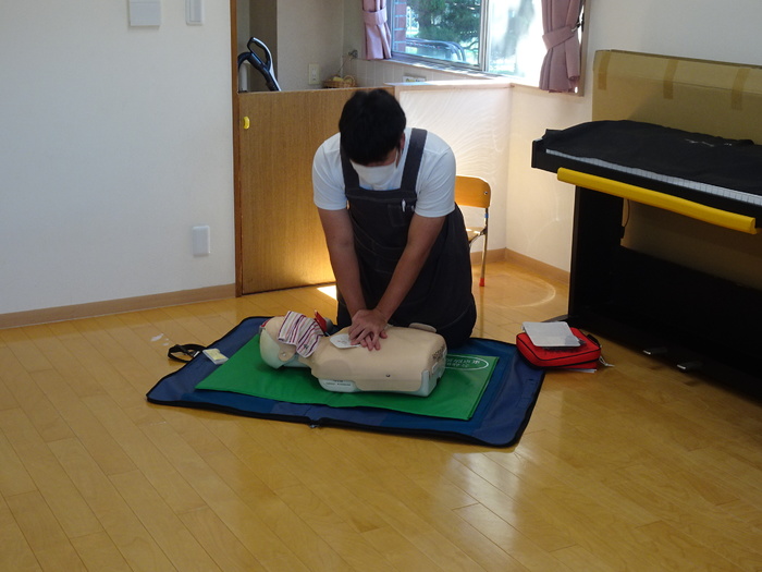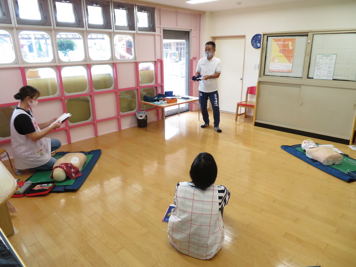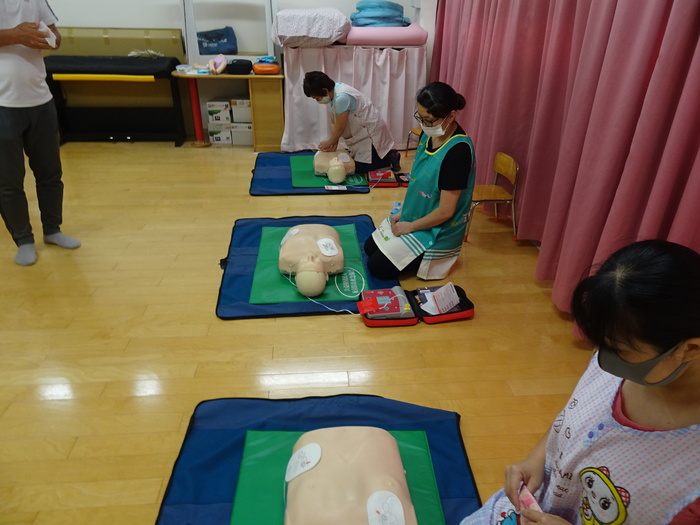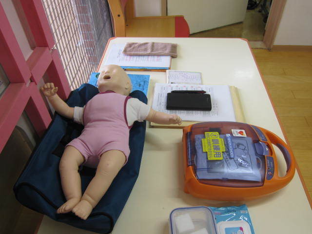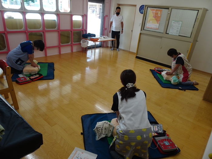 救命講習指導者の下、全職員が救命講習を受けました。以前から取得している職員は『再講習』、新規職員は『新規講習』を受けめぐみ保育園全職員が『救命技能認定証』を無事取得しました。怪我や事故が起こらないよう十分に安全管理を行いながら引き続き保育していきたいと思います。 | ||