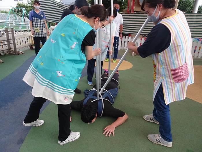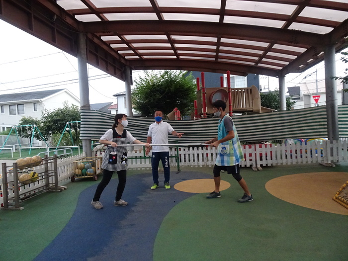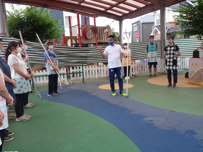 先日「不審者が園内に侵入した」という設定で職員の防犯指導を行いました。『さすまた』の置き場の確認や使い方を確認し実際に職員が不審者になり体験をしました。どうやって使ったら効果的か、どこの部分を押さえたら効果的かなどをみんなで確認し共有をしました。 | ||