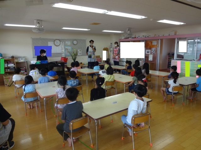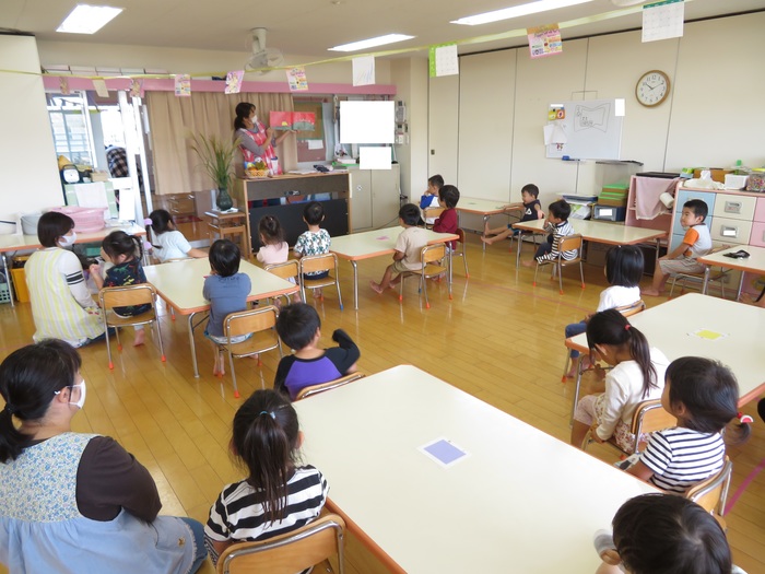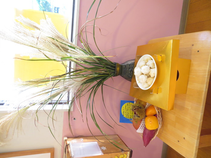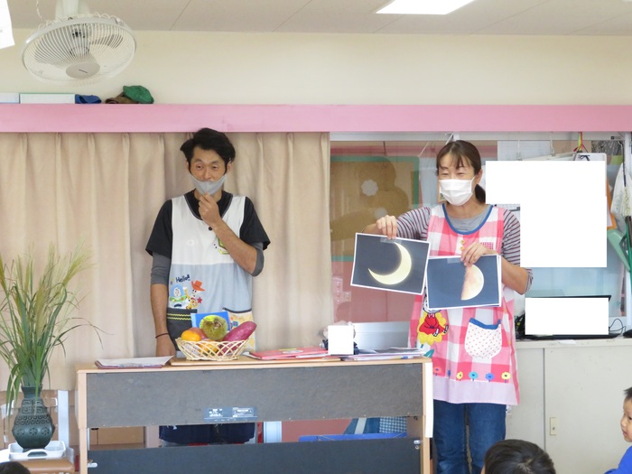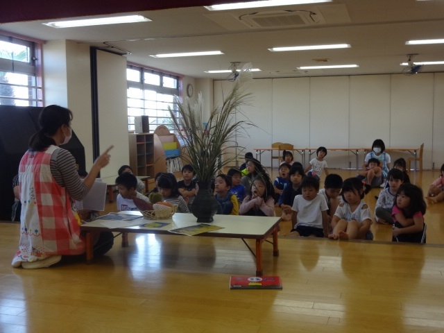 9月30日(水)にお月見会をしました。新型コロナウイルス感染症予防のため今回もお話は各クラスで聞きました。お月様の種類や果物の紹介、すすきの役割のお話を聞き子どもたちは真剣に話を聞いていましたよ!