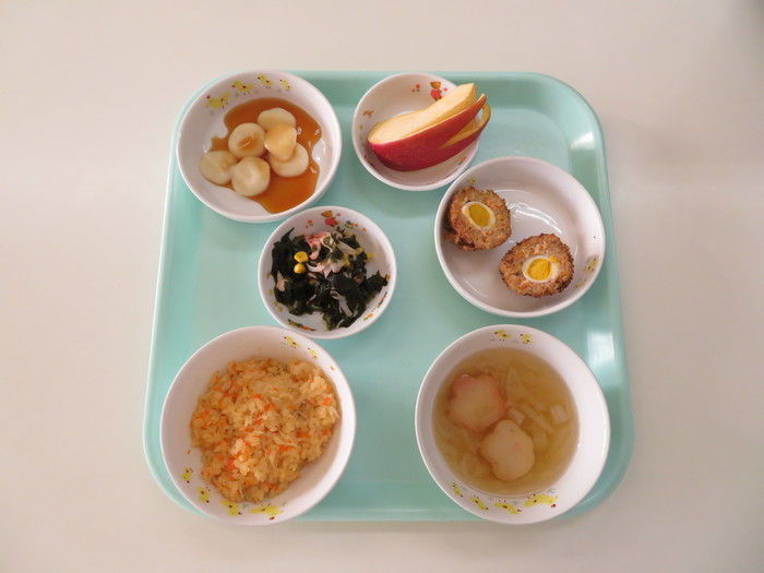 給食はお月見メニュー♪肉団の中に卵が入っている「ばくだん」!半分に割るとお月様に見えるんです☆おやつは幼児組のみ「みたらし団子」でした。