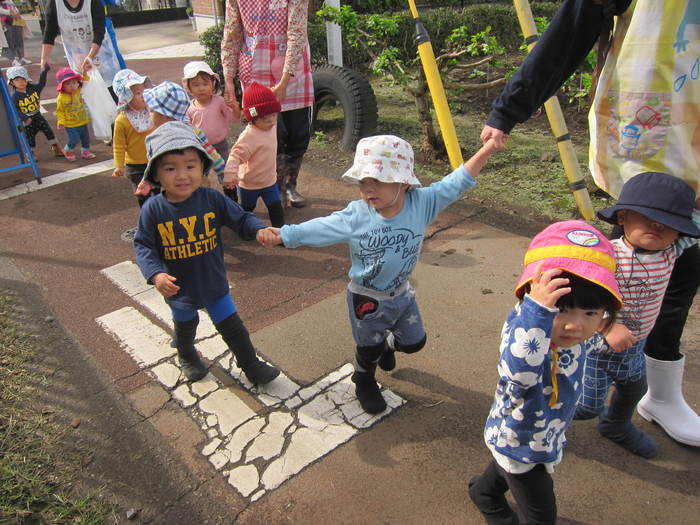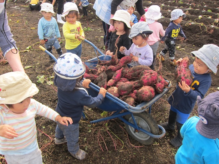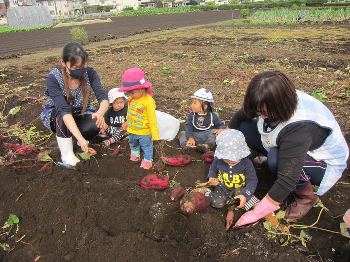 りす組(1歳児)~くま組(4歳児)は保育園の隣の畑にお芋掘りへ行きました。土から顔を出しているお芋を見つけると「あったよー!!」と大喜び☆一生懸命引っ張り大きなお芋を掘り上げました。幼児組は自分で掘ったお芋を自分のビニール袋に入れて園に戻りました。久しぶりの園外での活動でしたが子どもたちはとても楽しそうでした。 | ||