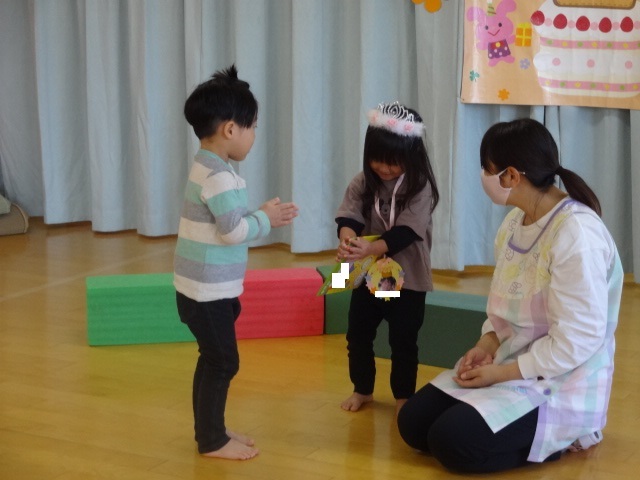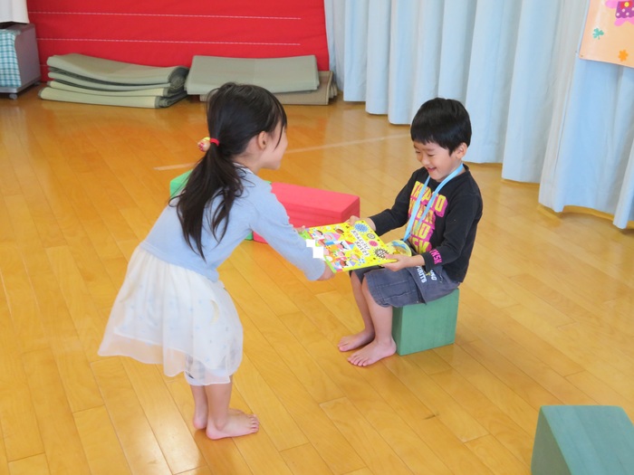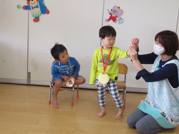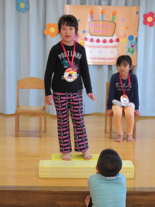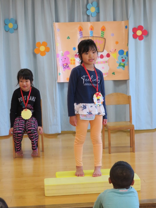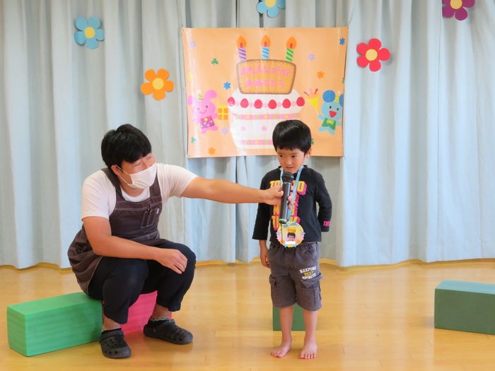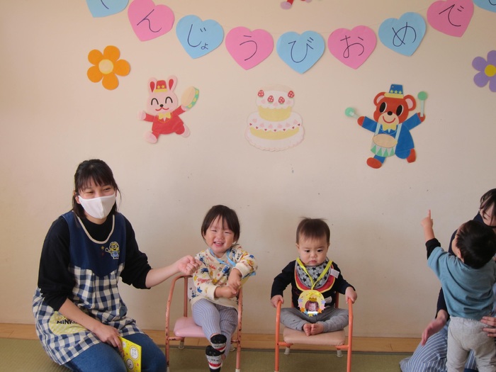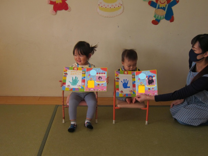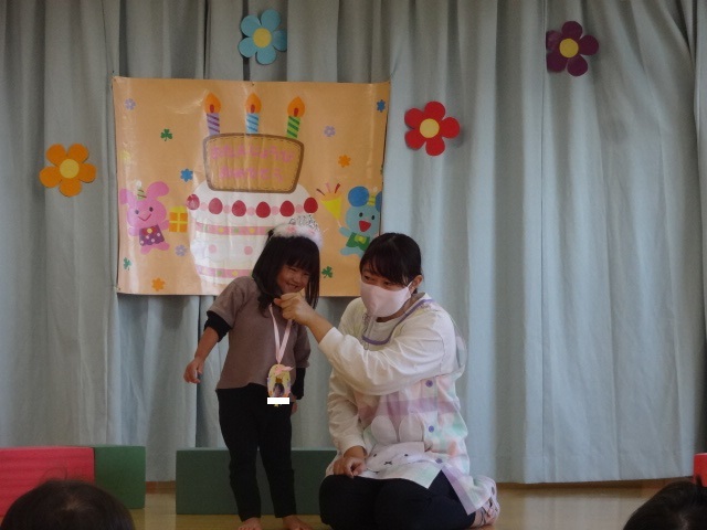 10月生まれの誕生会がありました。やっと回ってきた10月生まれの誕生者が主役になれる日!!ドキドキしながら前に立ってお祝いしてもらいとても嬉しそうでした。全員で集まっての会は難しいですがクラスのお友だちにお祝いしてもらい笑顔に満ちていました。ひとつ大きくなったお友だち。おめでとう!! | ||