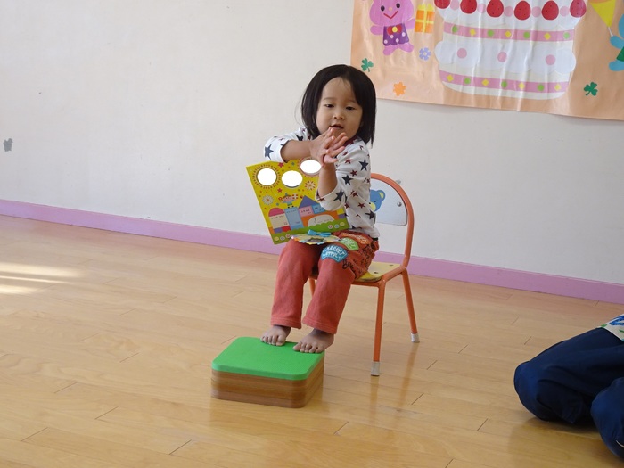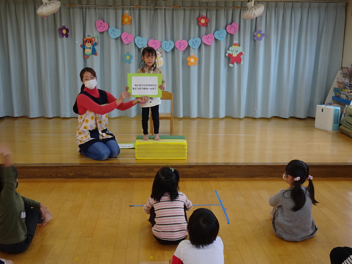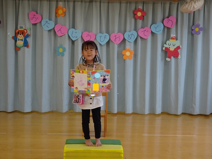 照れながらも名前・年齢等みんなの前で大きな声で言えました♪ひとつお兄さん・お姉さんになったお友だちおめでとう!!