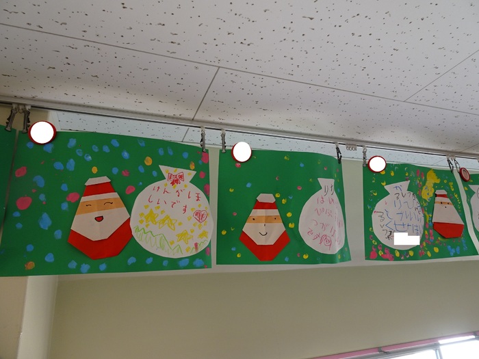 らいおん組 サンタさんを折り紙で折り袋には欲しいものを書きました。