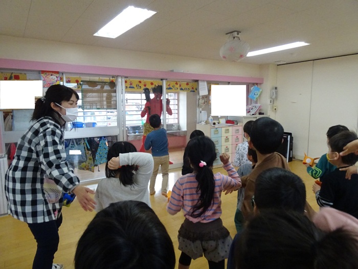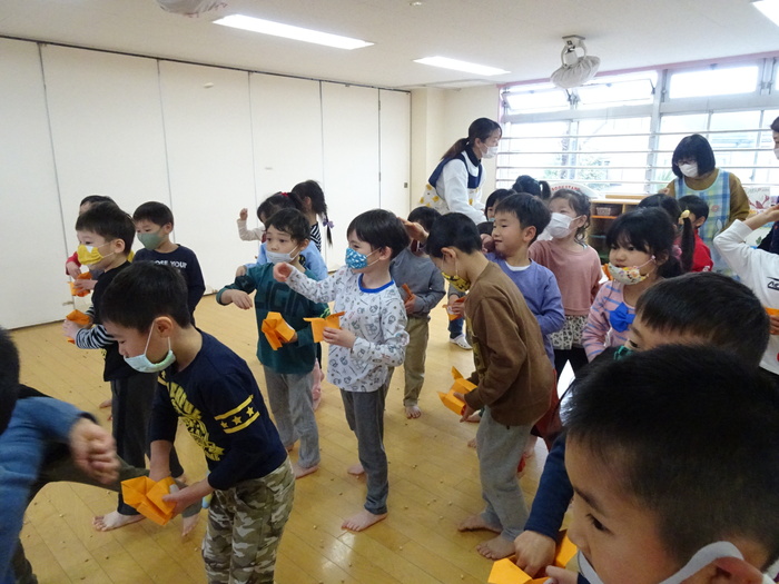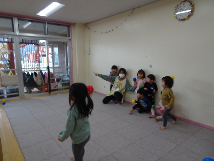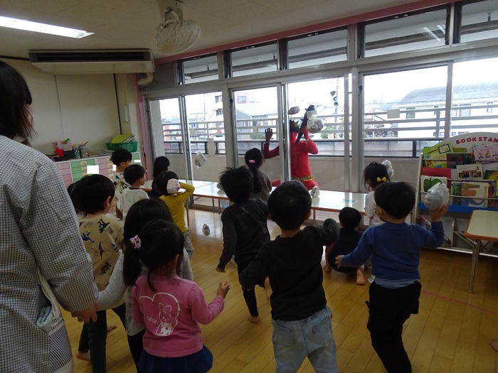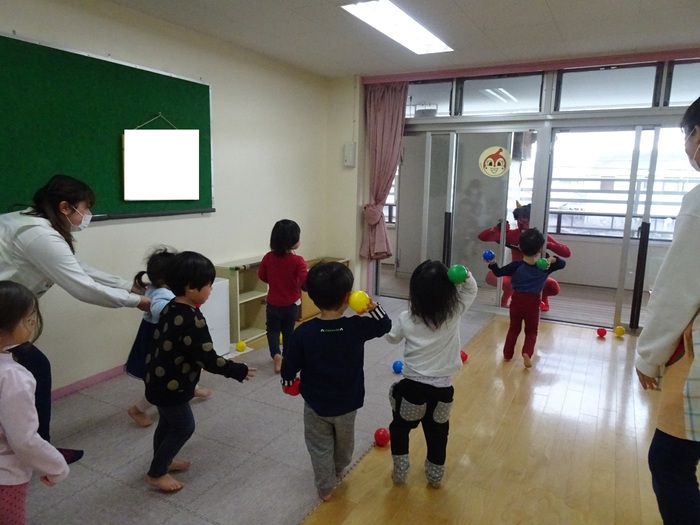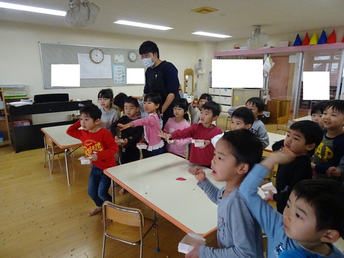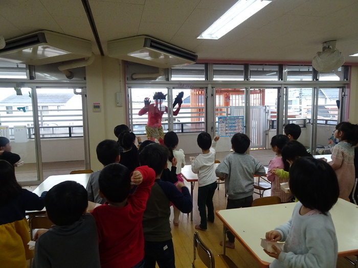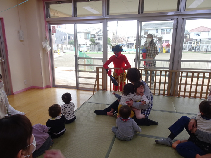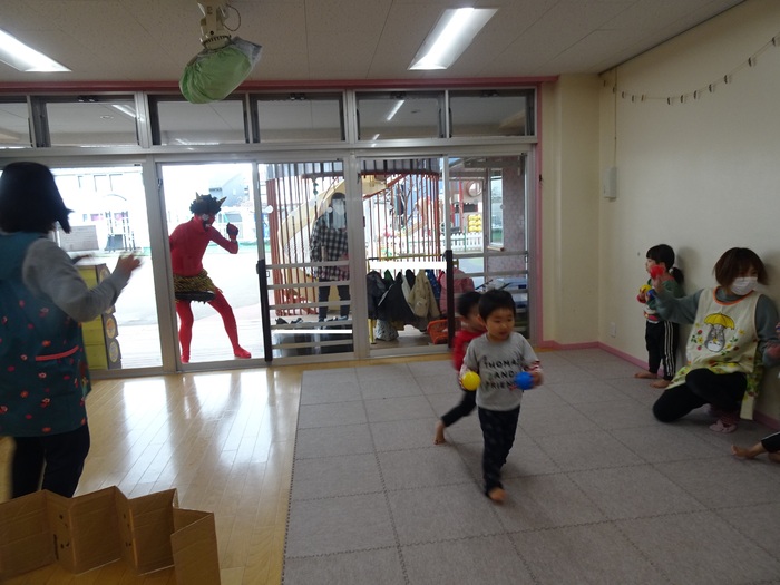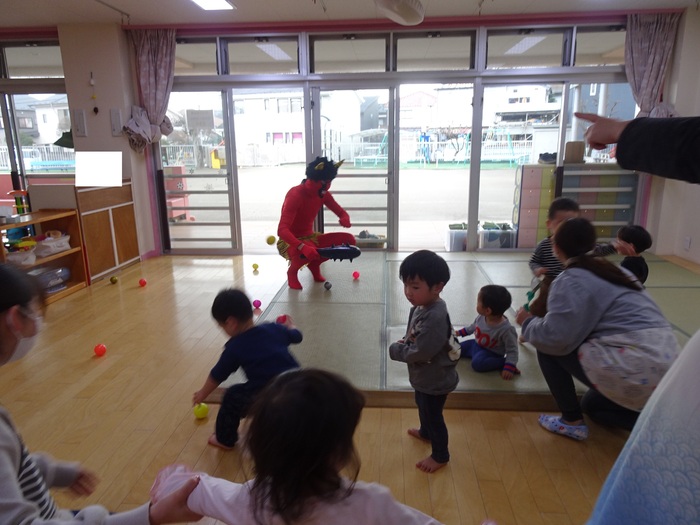 2月2日(火)は節分。めぐみ保育園にも鬼がやってきました。テラスからやってきた鬼にドキドキしながら「鬼は~外!福は~内!」と大きな声で豆に見立てたボールを投げ退治しました。4・5歳児は本当のお豆で鬼退治をしました。 | ||