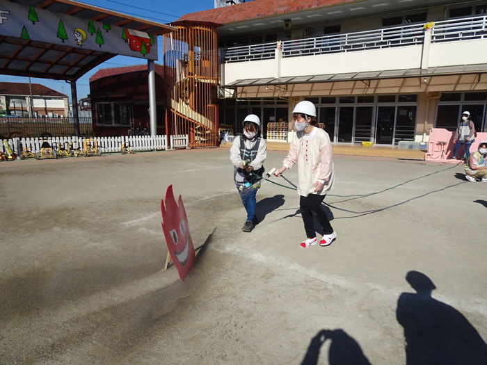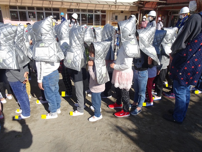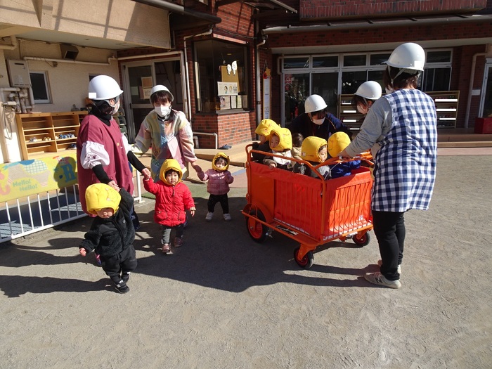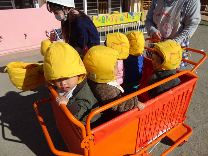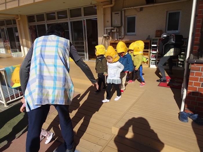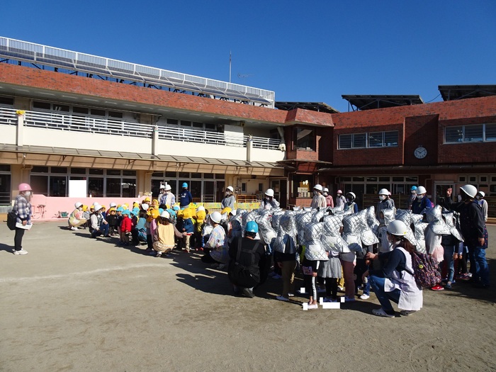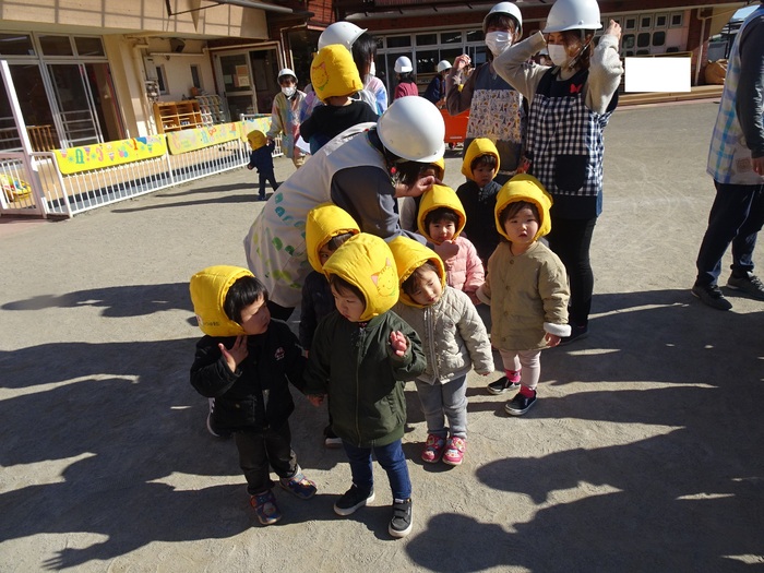 避難訓練がありました。今回は「地震」の訓練です。子どもたちは防災頭巾をかぶって園庭に集まります。月に1回行う大事な訓練。みんな真剣な表情で参加しました。今回は職員が「通報訓練」を行いました。 | ||