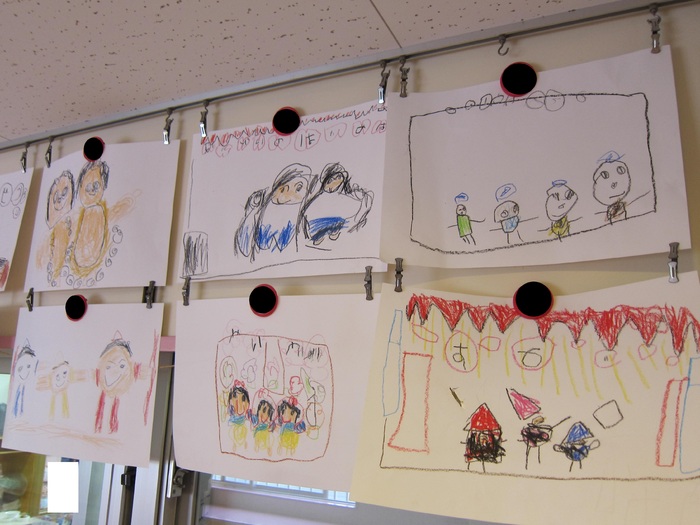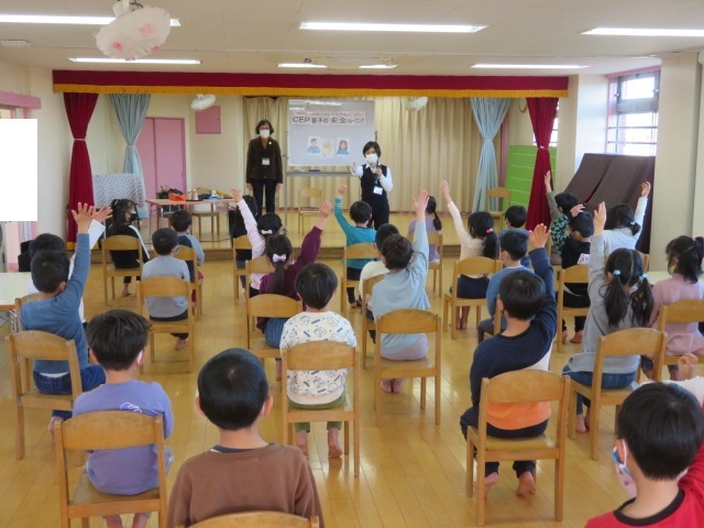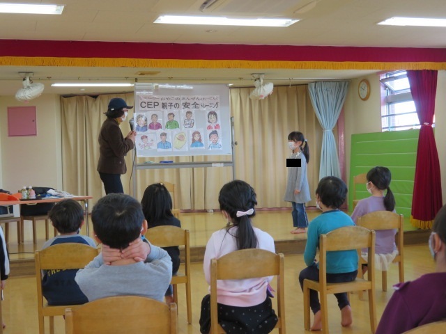 先日、年長児を対象に「親子安全教室」が行われました。例年保護者の方も参加してもらい一緒にお話を聞き体験して頂くのですが今年は新型コロナウイルス感染拡大予防の為、子どものみで参加しました。 「道を聞かれたときはどうする?」「公園でカードを見せてあげるから家においで。と声を掛けられたらどうする?」などの対応を教えてもらいました。 | ||