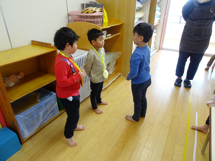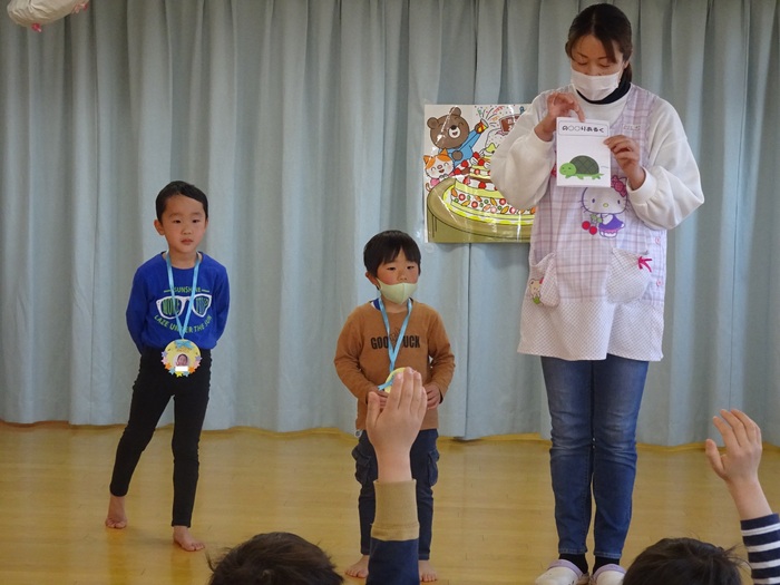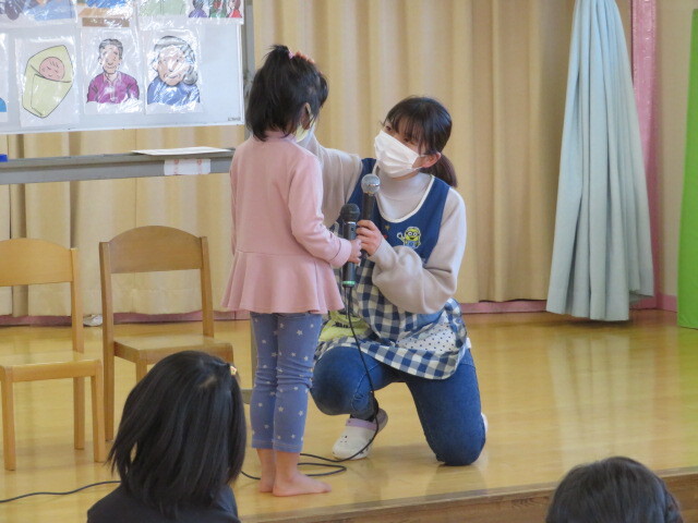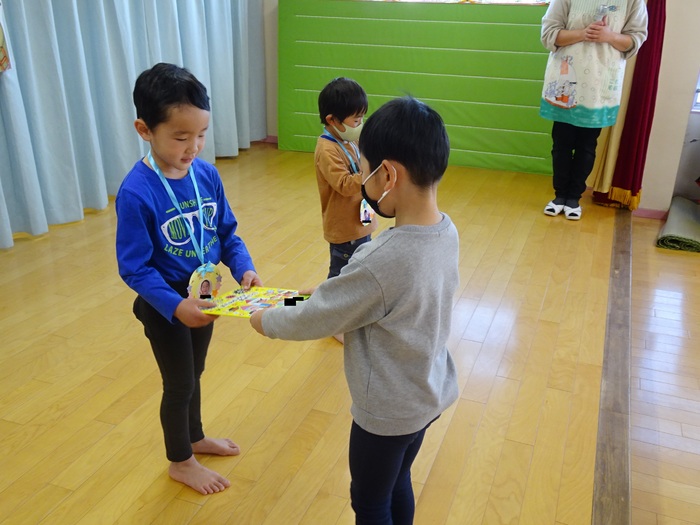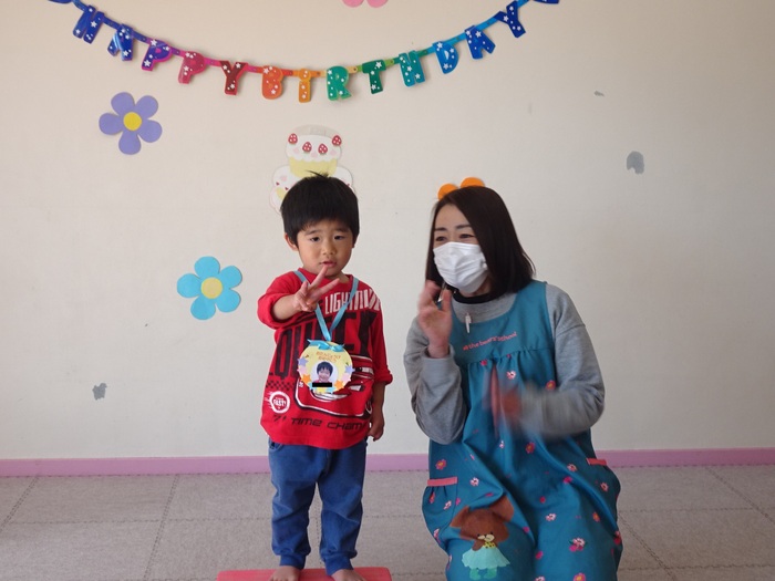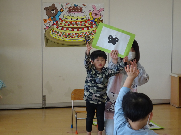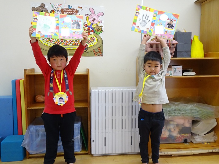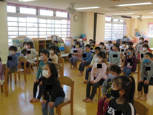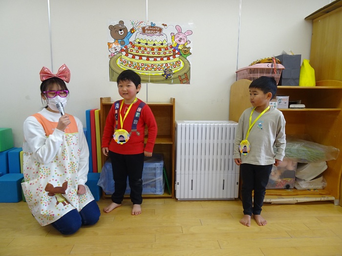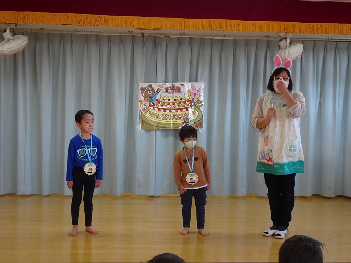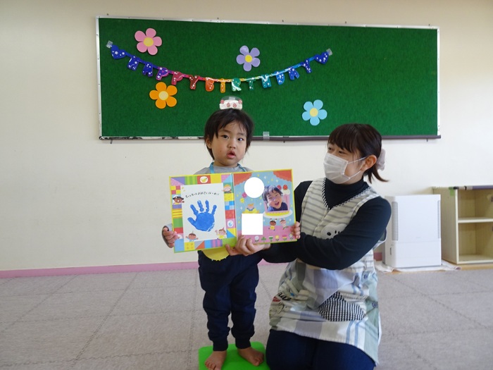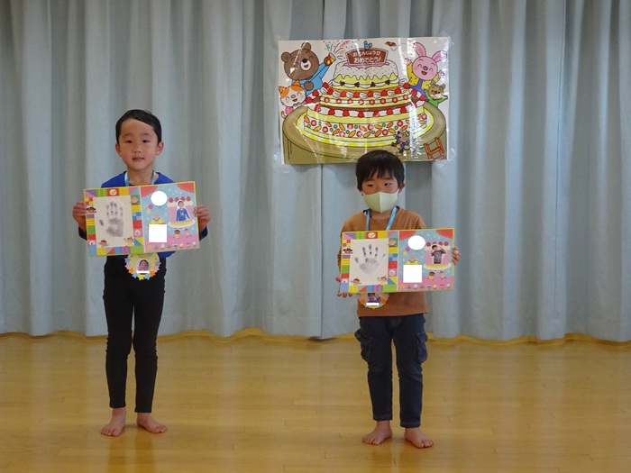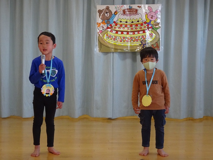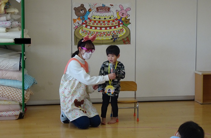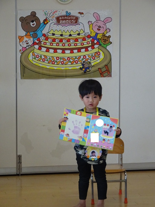 2月生まれの誕生会がありました。係の先生が各クラスを回って誕生者の紹介をするとお友だちから「おめでと~」とお祝いの言葉が聞こえてきました。誕生会は年に1度主役になれる特別な日です。緊張しながらも笑顔の花がたくさん咲きました♪ | ||