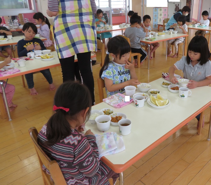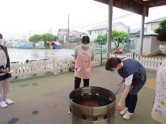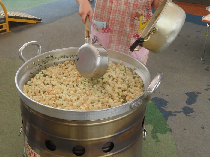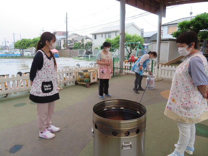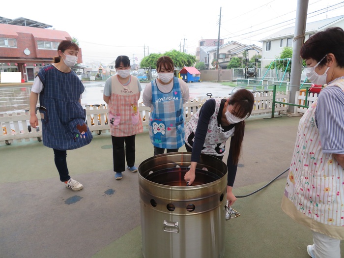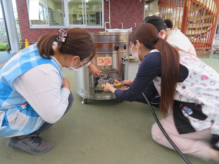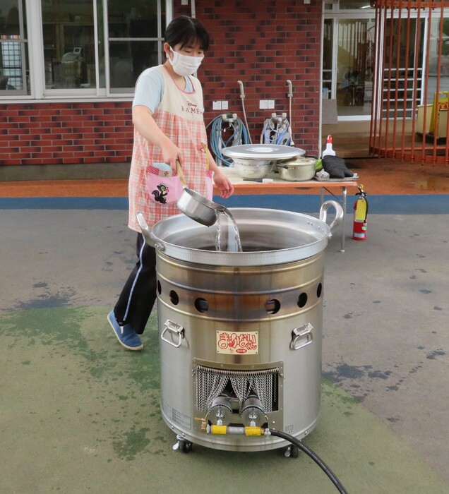災害時など・・いざというときに炊き出しが出来るように職員が外で味噌汁を作り給食で食べました。 | ||