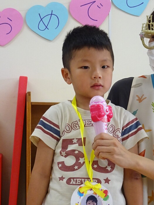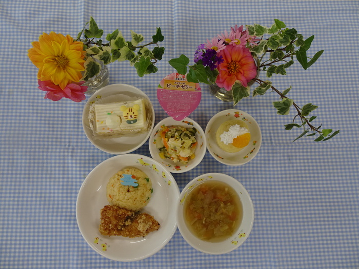 誕生会メニュー 給食 たけのこご飯 カジキのカレー揚げ 花畑サラダ ベーコントマトレタススープ ゼリー 麦茶 おやつ ケーキ 麦茶 | ||