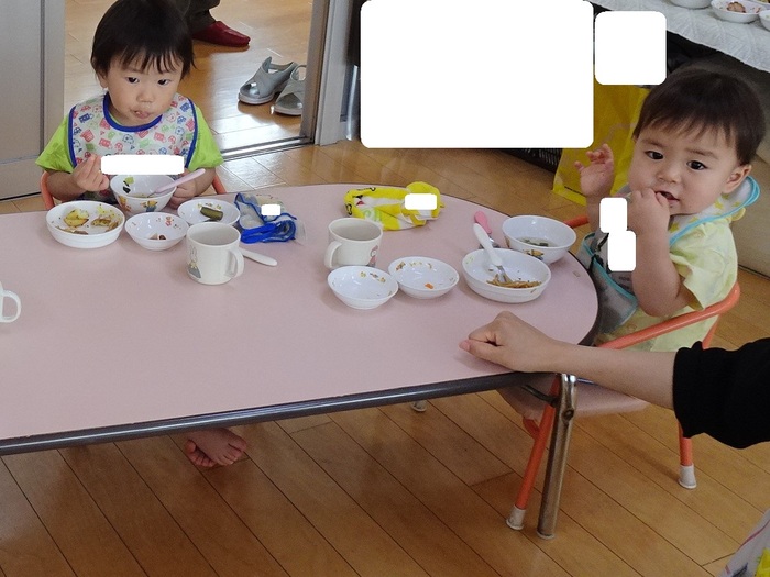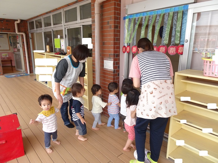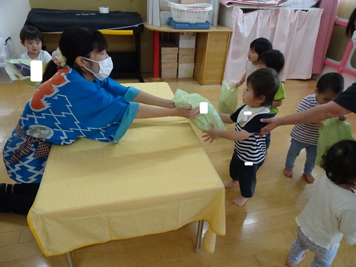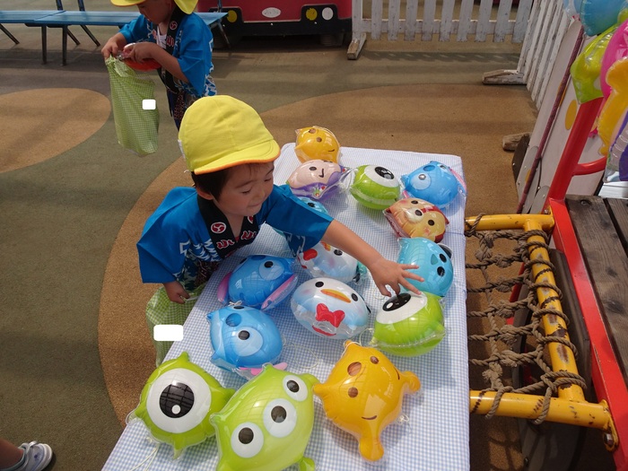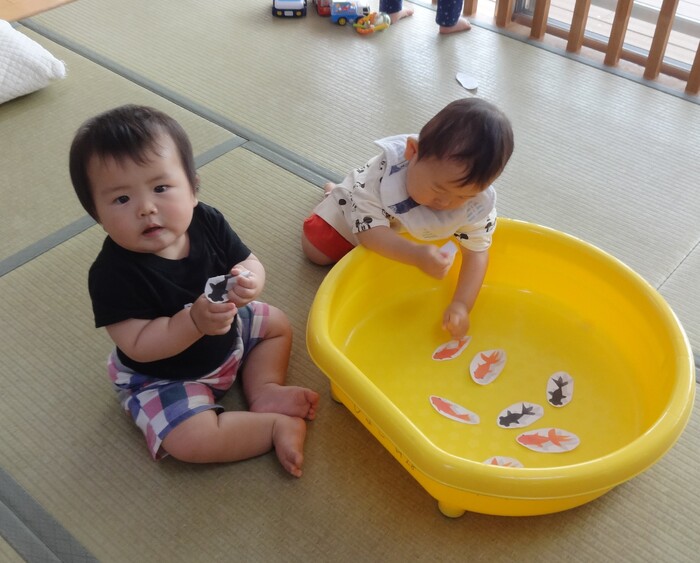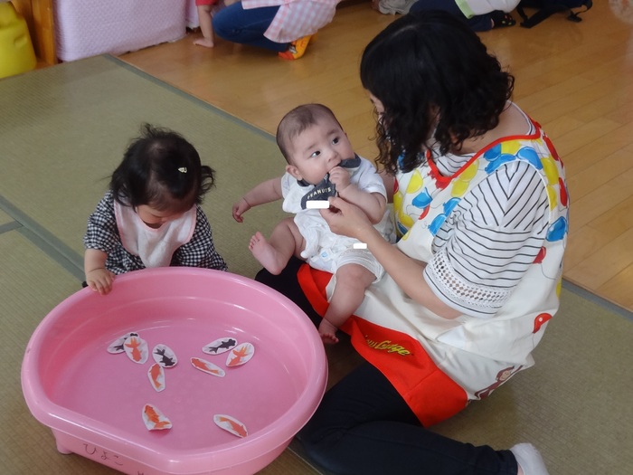 0歳児クラスは、先生と一緒にお部屋で縁日ごっこを楽しみました🐟 | ||