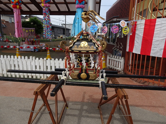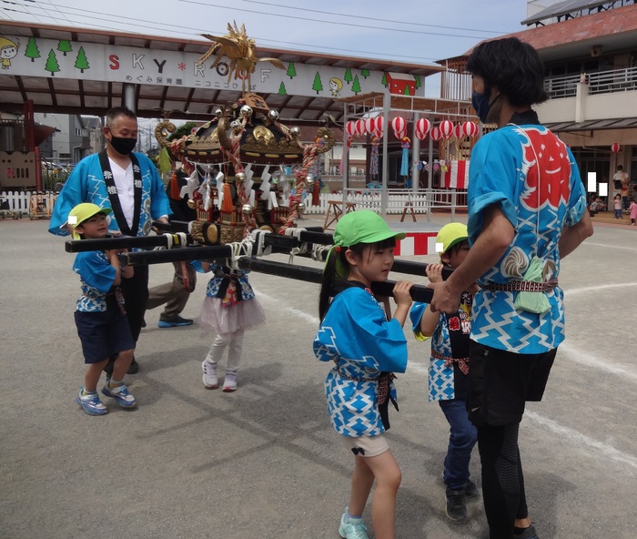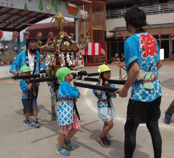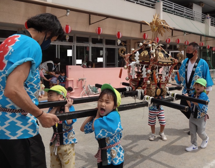 お神輿ワッショイ!! 5歳児クラスのお神輿は、先生と一緒に間隔をあけて4人ずつ持って園庭を半周ずつ回りました。 | ||