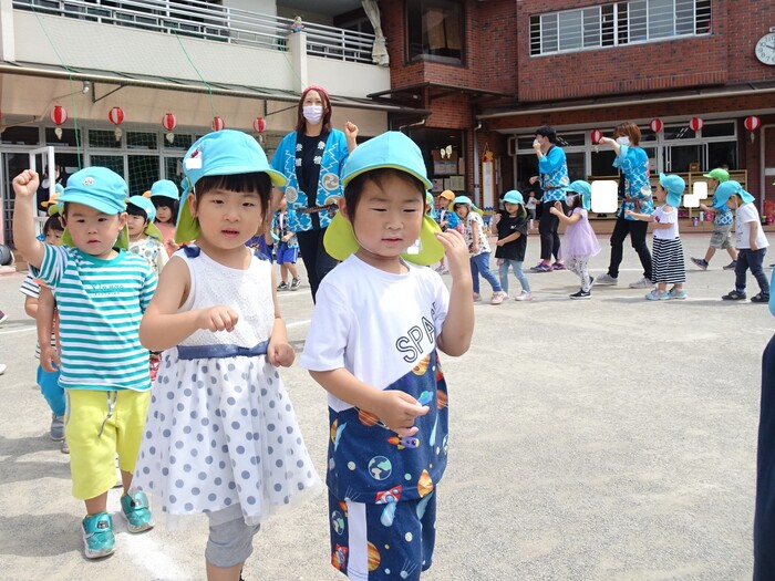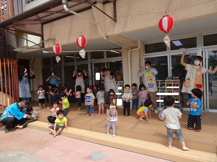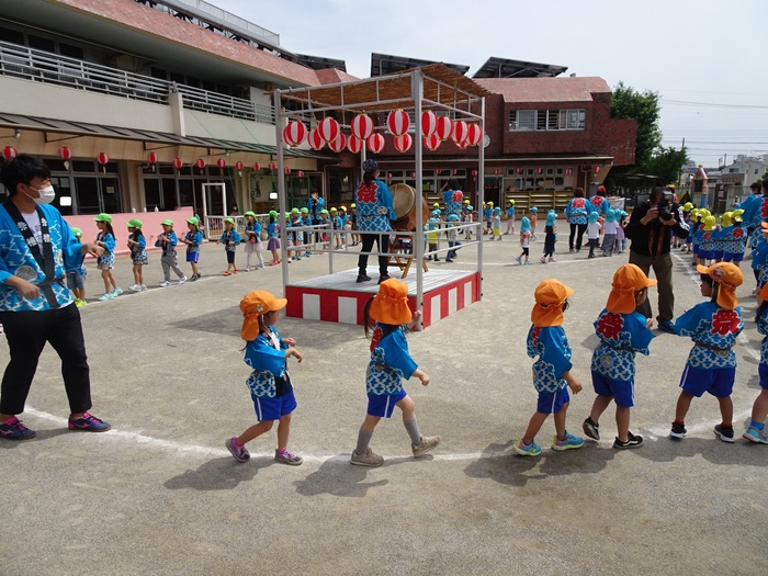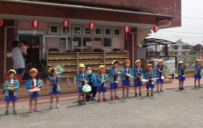 4歳児クラスは、自分たちで作った団扇で5歳児クラスのお神輿を応援しました。 | ||