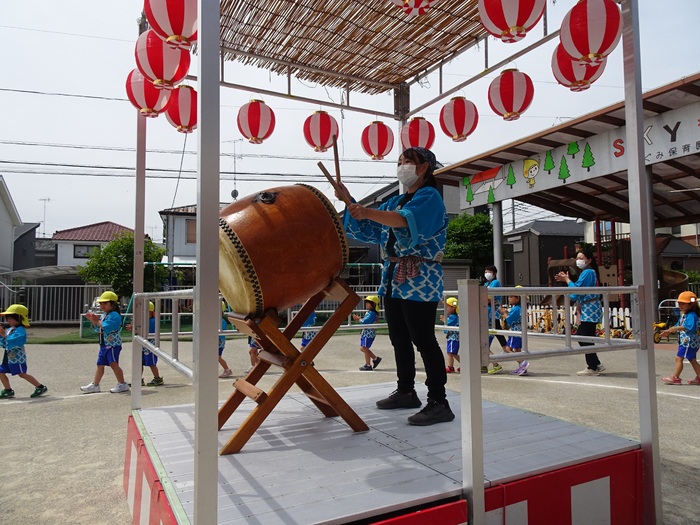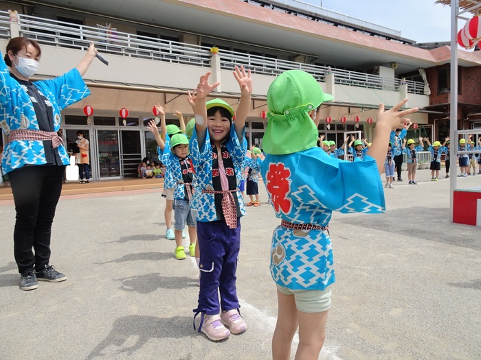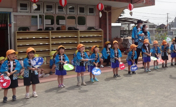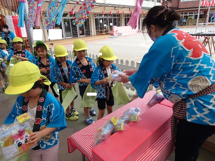 🎵盆踊りに 年長さんの おみこしワッショイ!! 縁日と楽しみました。 | ||