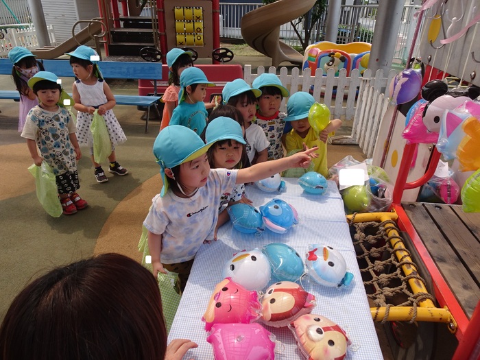 幼児クラスは、ニコニコ広場の縁日会場へクラスごとにお買い物に行きました。 | ||