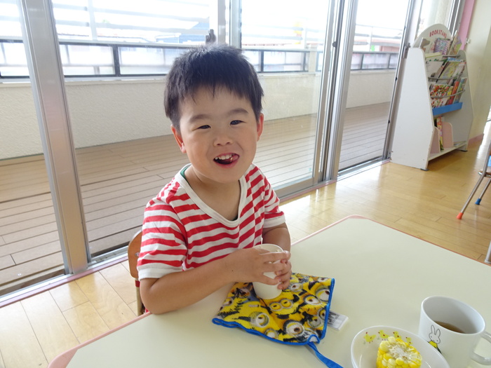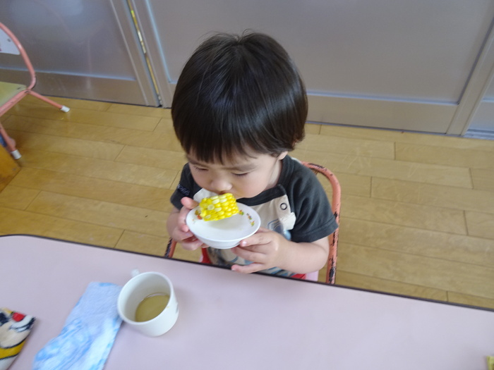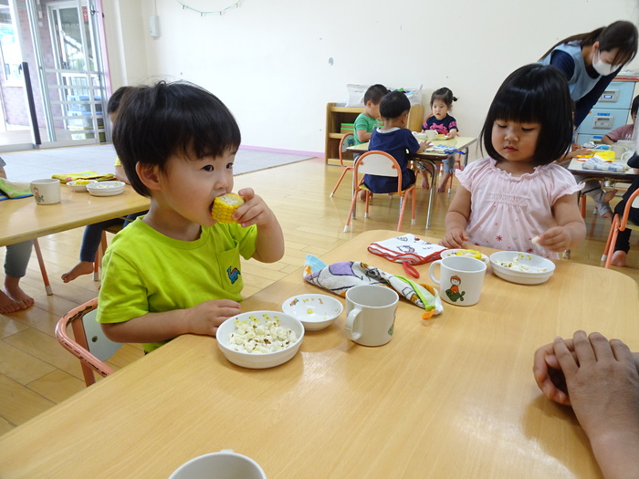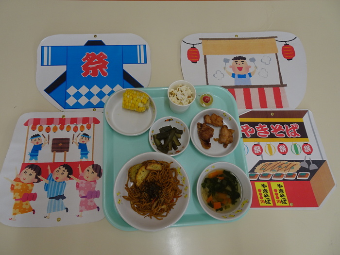 子ども祭りメニュー 給食 焼きそば 唐揚げ グリルポテト きゅうりの浅漬け 色どりスープ ゼリー 麦茶 おやつ ポップコーン 蒸しとうもろこし 麦茶 | ||
