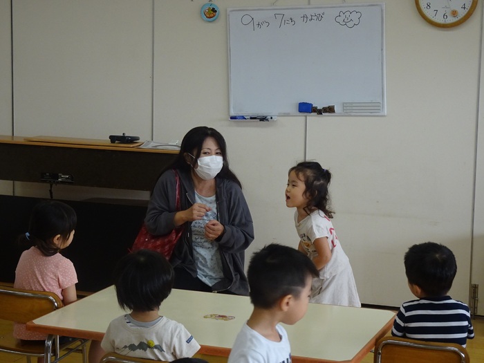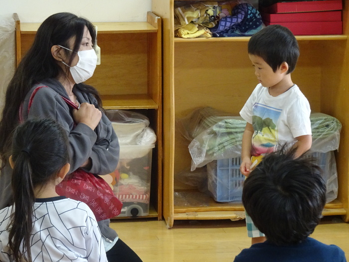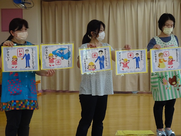 1人で外に出かけることは、危ないことを話し約束をしました。 「いかのおすし」の合言葉でいざという時の逃げ方を教わりました。 いかない のらない おおごえをだす すぐににげる しらせる 良い機会なのでお家でもお話してみて下さい。 | ||