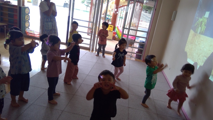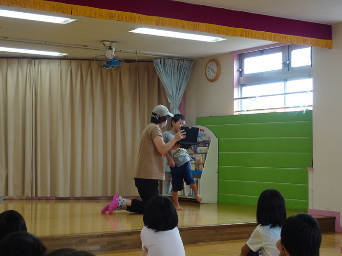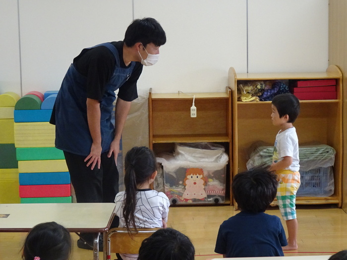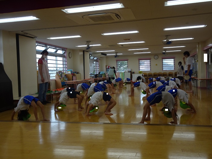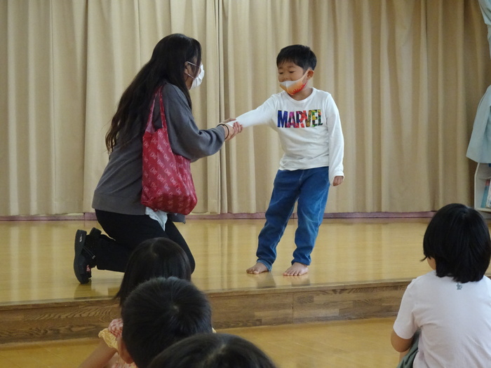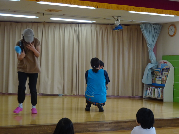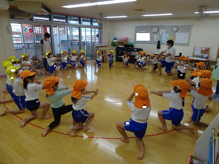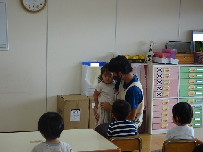 今回は、幼児クラス対象で各クラスで行いました。不審者役の先生と一緒にシュミレーションをしました。代表の子に前に出てもらい体験しました。 | ||