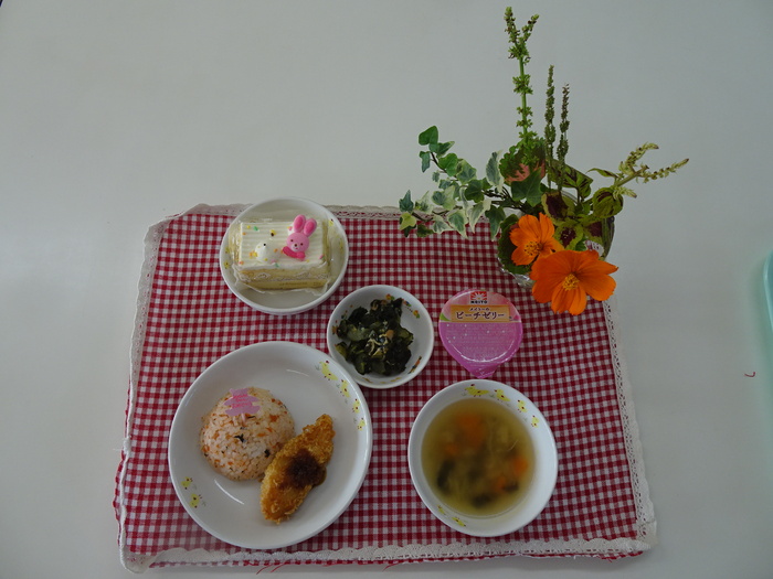 誕生会メニュー しそ鮭ご飯 白身魚のフライ 蒸し鶏サラダ きのこスープ ゼリー おやつ ケーキ 麦茶 | ||
