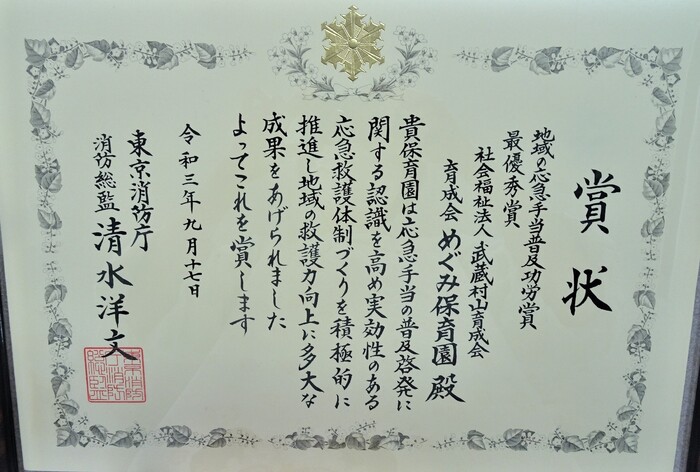 めぐみ保育園井戸端ホールにて表彰式を行いました。 東京消防庁より、めぐみ保育園での取り組みとして保育士だけでなく栄養士及び調理師を含め100%の全職員が救命講習を受講している事や、怪我などに対してマニュアルを作成して取り組んでいる事、園内における想定訓練の実施等が認められ最優秀賞を頂きました。 | ||