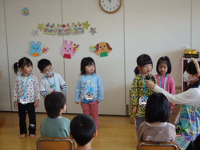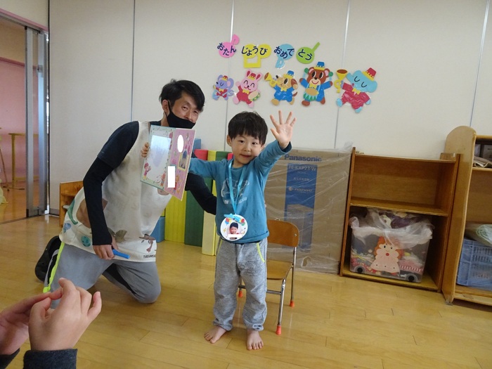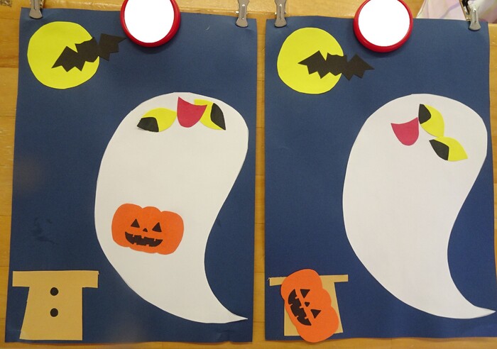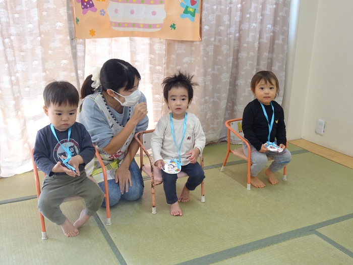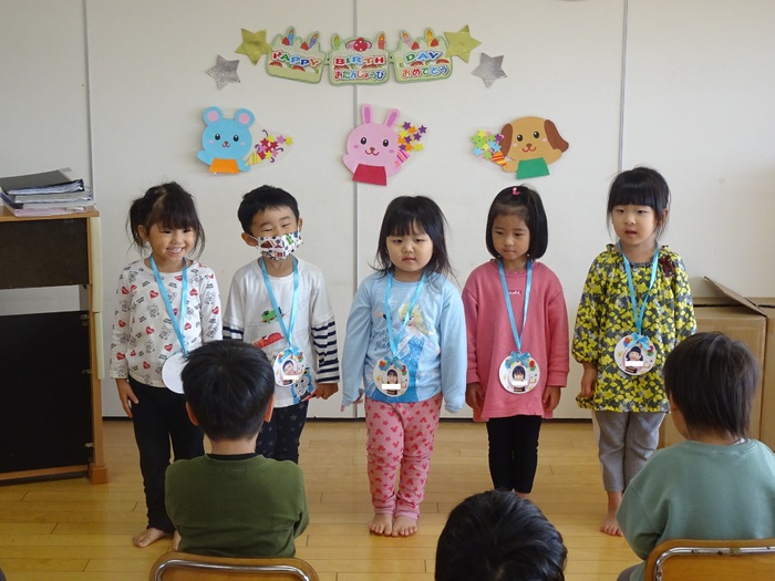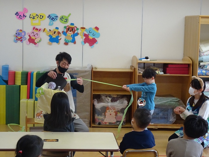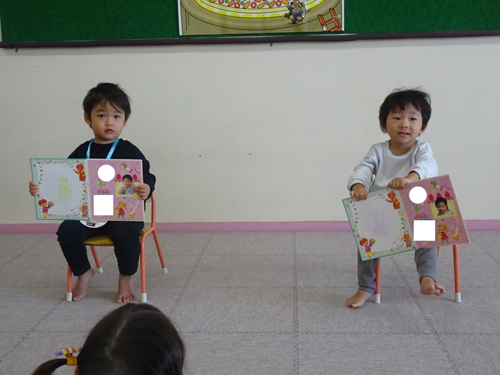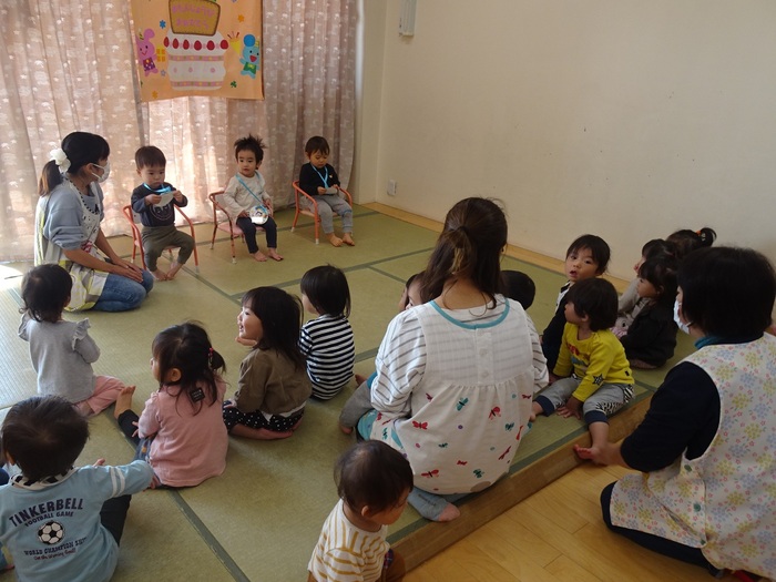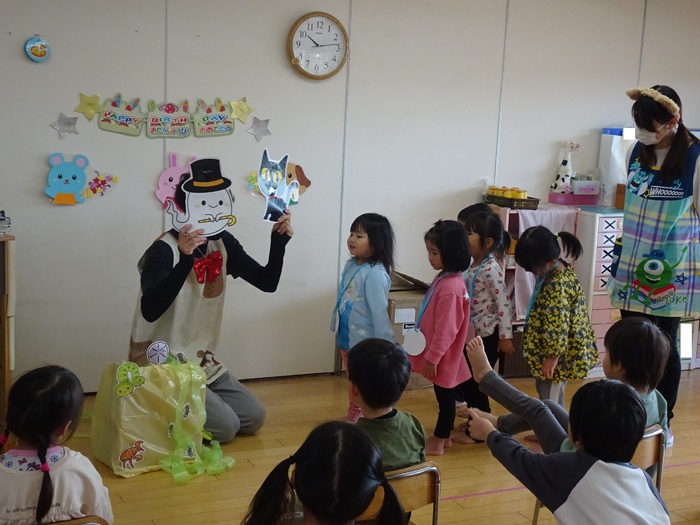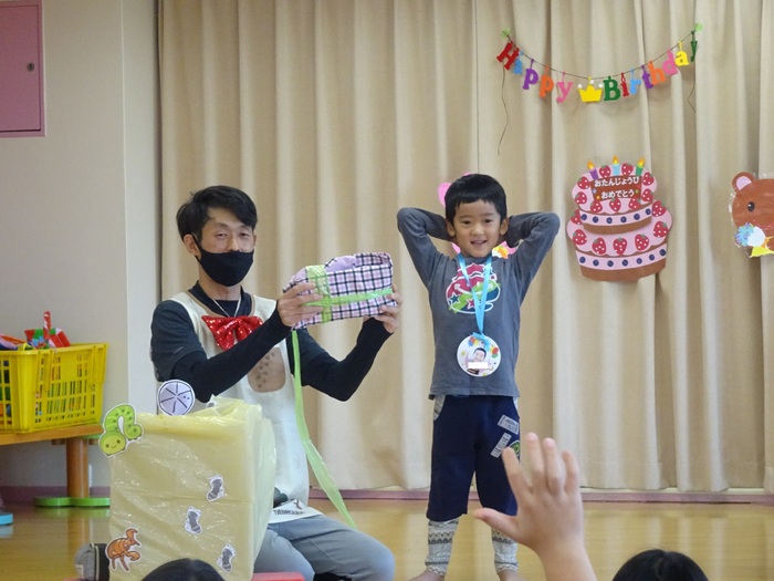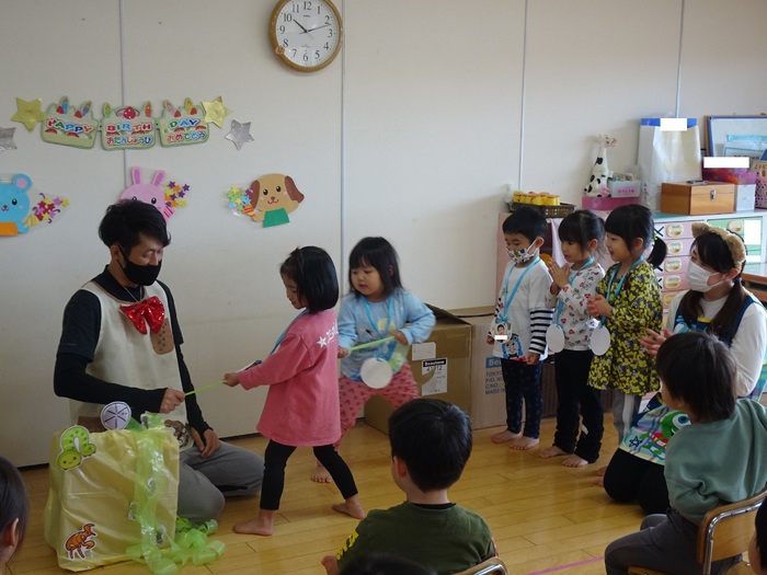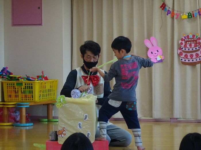 幼児クラスは、催し物「うんとこしょ。引っ張たらこれなんだ?」を誕生者に手伝ってもらいながら楽しみました。箱の畑からツルを引っ張ると・・ハロウィンのお化けや、5歳児クラスでは、担任の筆箱やエプロンが出て来て誰のか?当てっこしました。 | ||