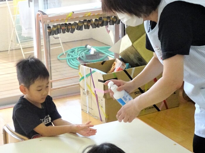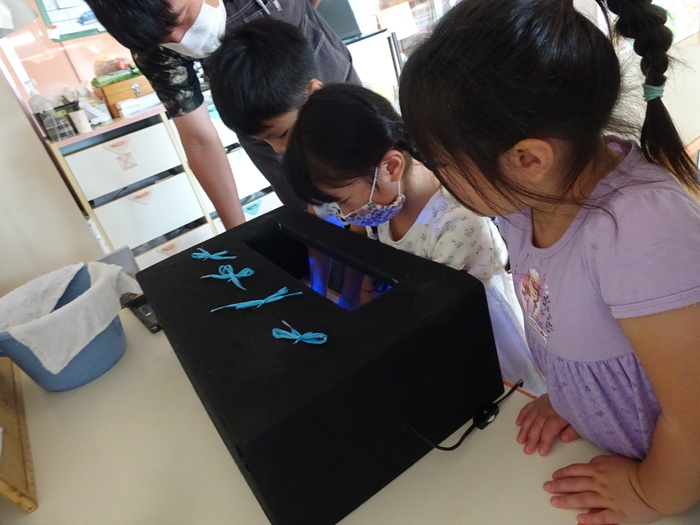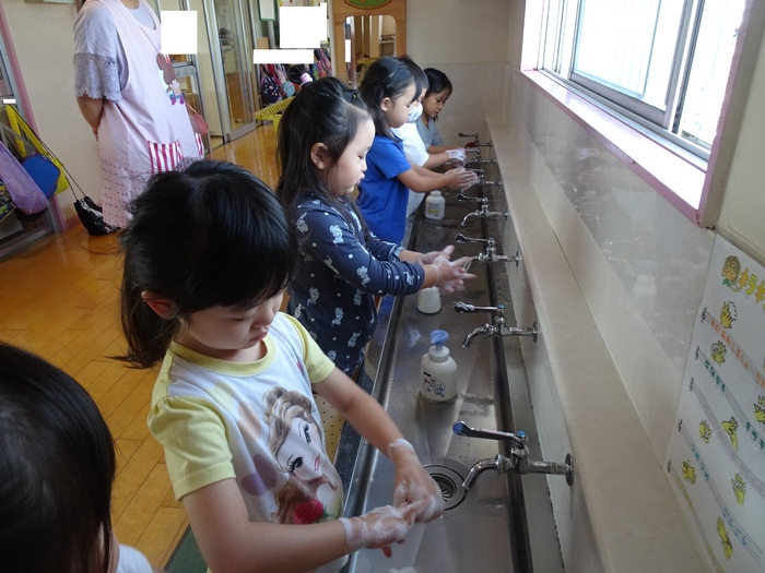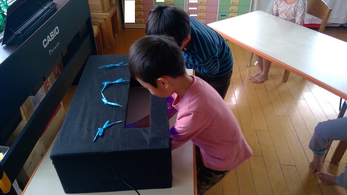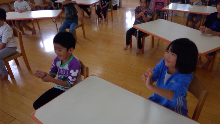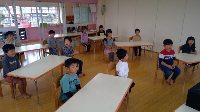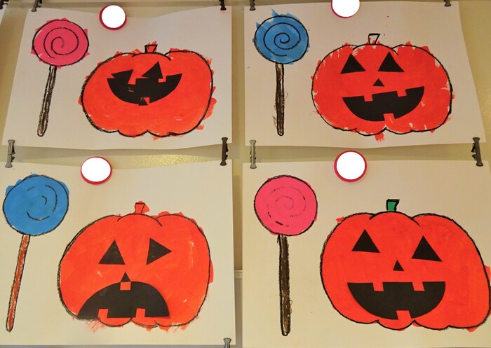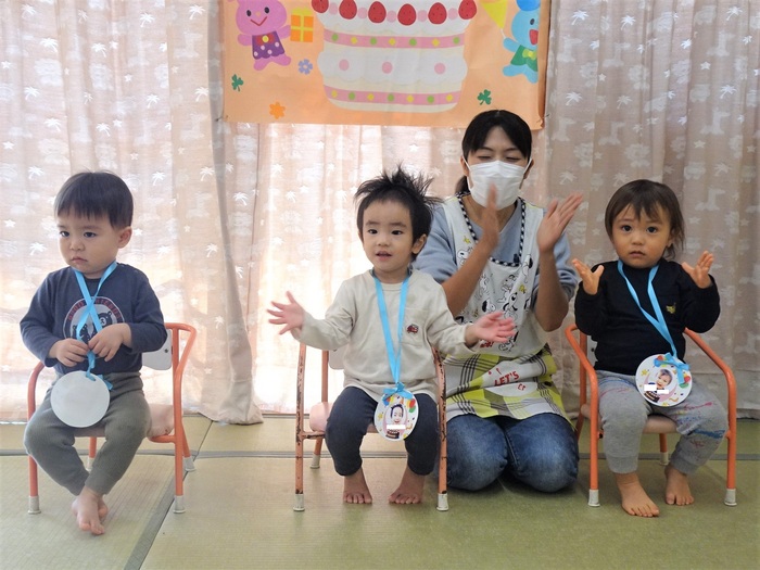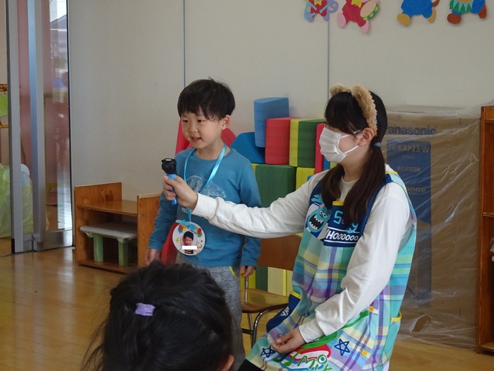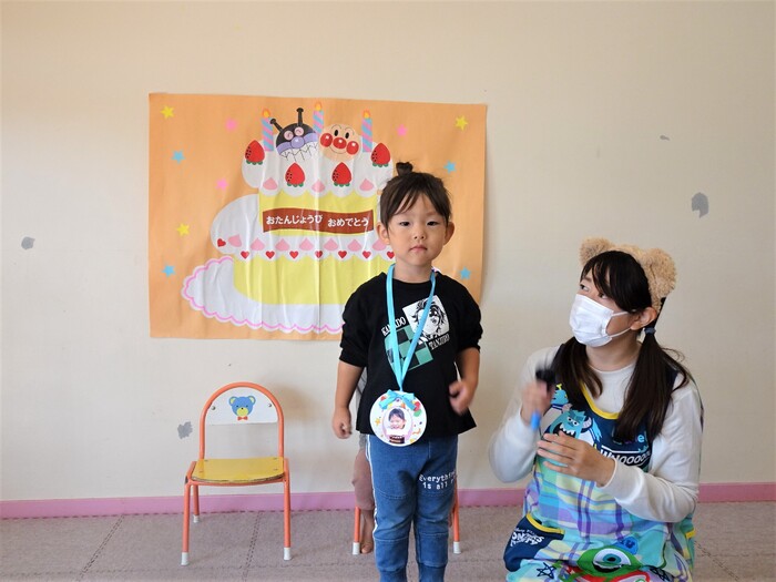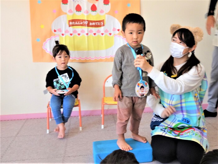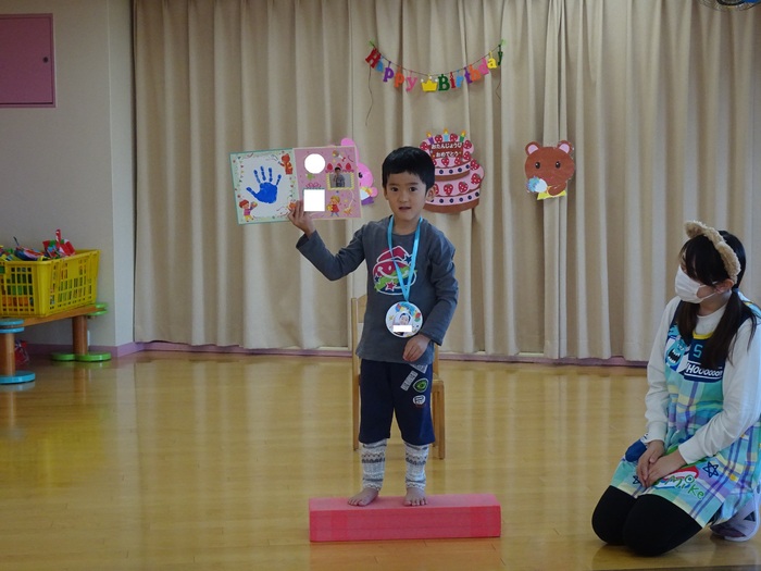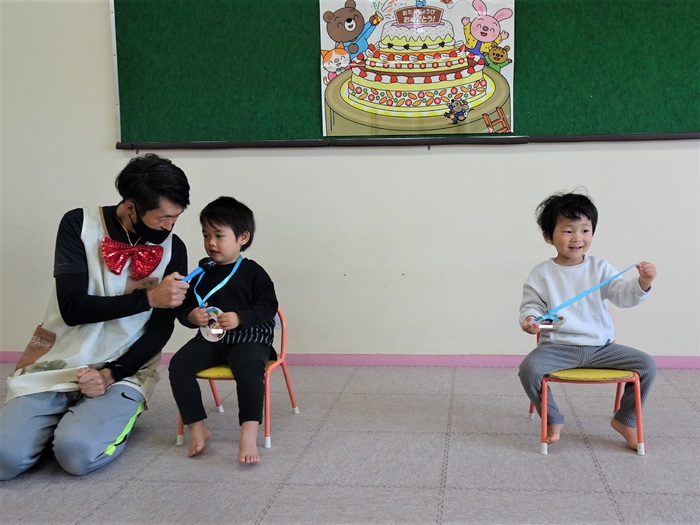 幼児クラスは、催し物「うんとこしょ。引っ張たらこれなんだ?」を誕生者に手伝ってもらいながら楽しみました。箱の畑からツルを引っ張ると・・ハロウィンのお化けや、5歳児クラスでは、担任の筆箱やエプロンが出て来て誰のか?当てっこしました。 | ||