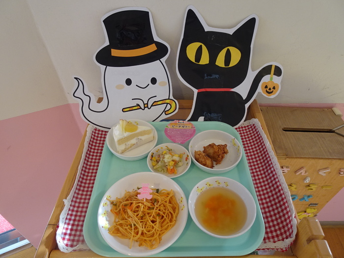 誕生会メニュー スパゲティーナポリタン 鶏の唐揚げ ジャーマンサラダ コンソメスープ ゼリー おやつ ケーキ 麦茶 | ||