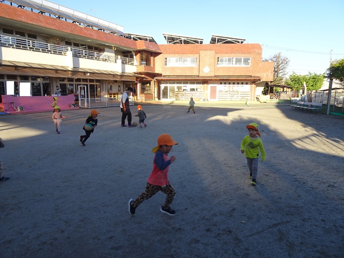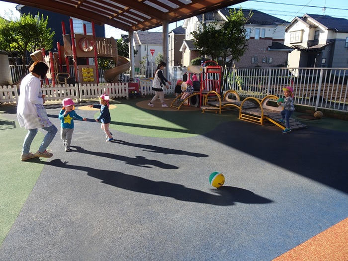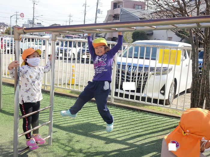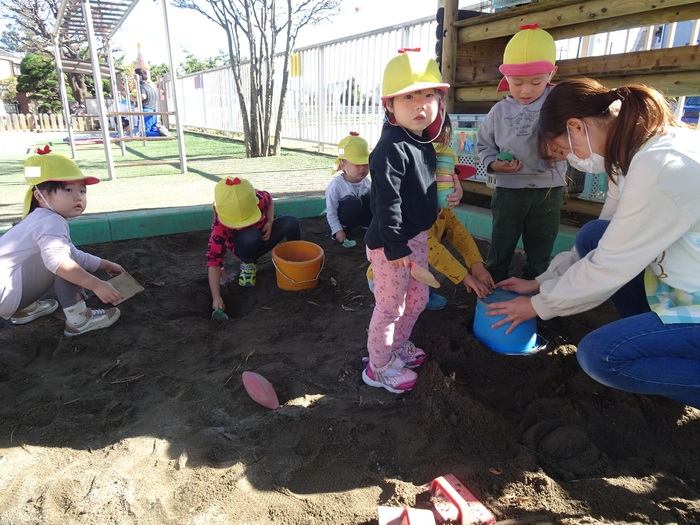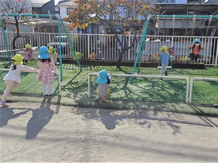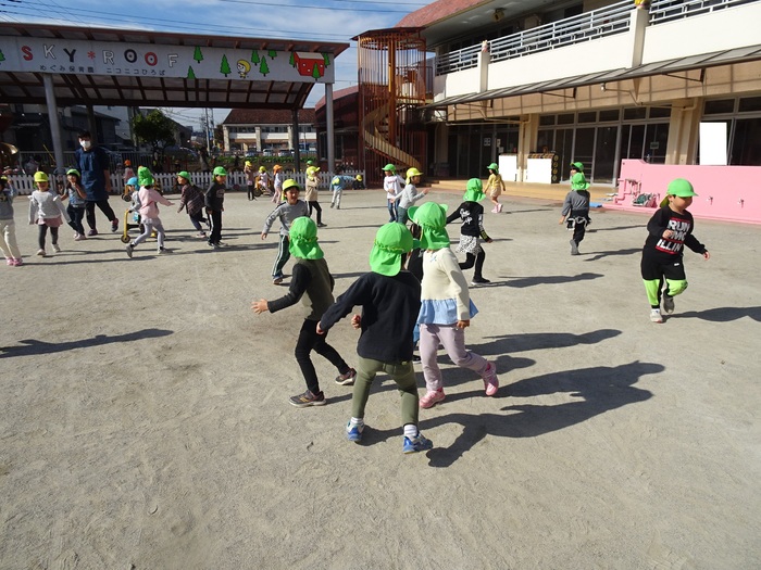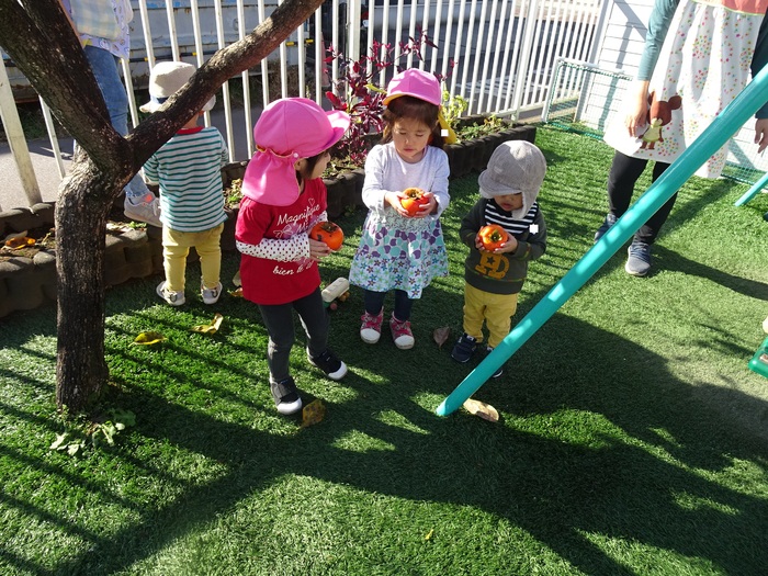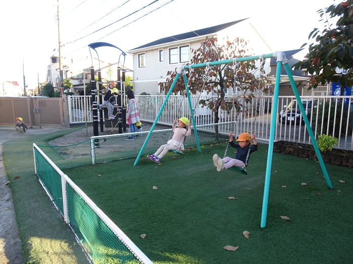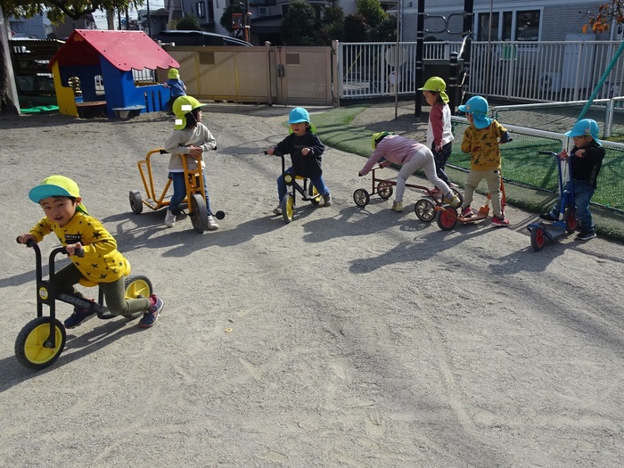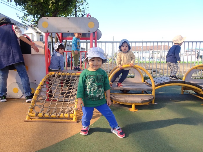 11月は青空が広がり外でたくさん遊べました。朝から外に出たり、午前中外に出られなかった日は、おやつ後に出て遊んだりもしました。新型コロナウイルス感染予防でお散歩も控えていましたが、近隣散歩から少しずつ歩く練習のお散歩に出始めています。 | ||