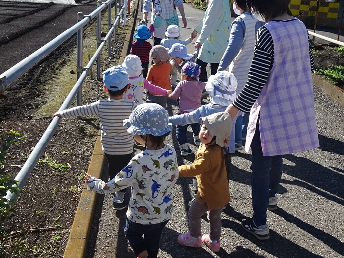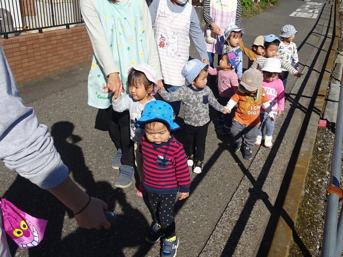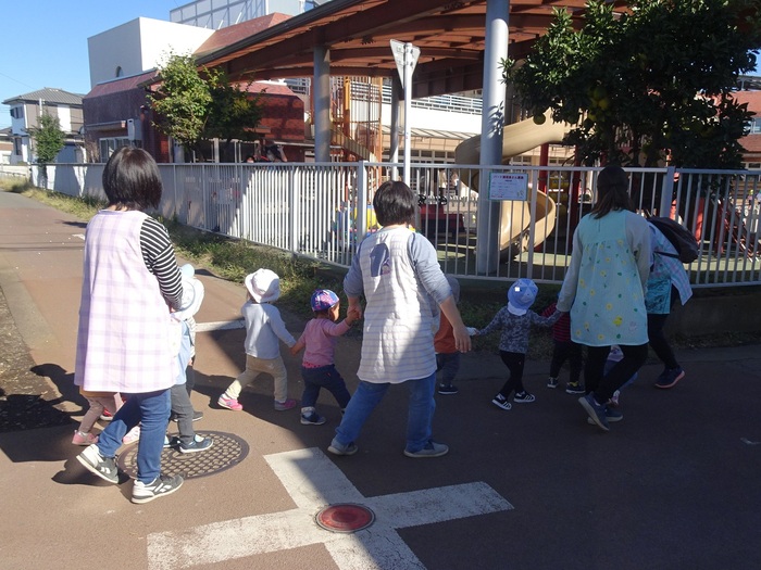 お散歩に出かけました。先生やお友だちと手をつないで近隣を歩きました。道路ではガソリンスタンドや車を見学しました。 | ||