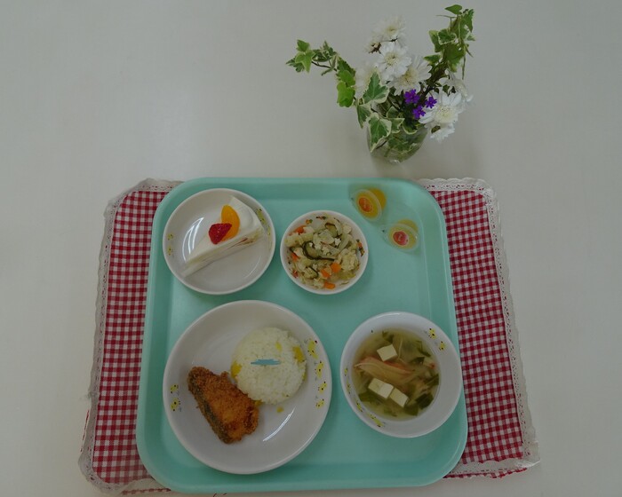 誕生会メニュー 栗ご飯 鮭フライ ささみのサラダ 豆腐とカニのスープ ゼリー おやつ ケーキ 麦茶 | ||