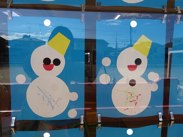0歳児クラス:「雪だるま」シールで目を貼ったり、お絵描きしました。