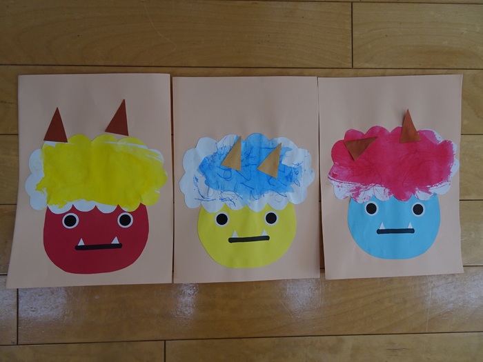 1歳児クラス:「鬼」髪の毛は、はじき絵をしました。鬼の角も自分で糊付けしました。