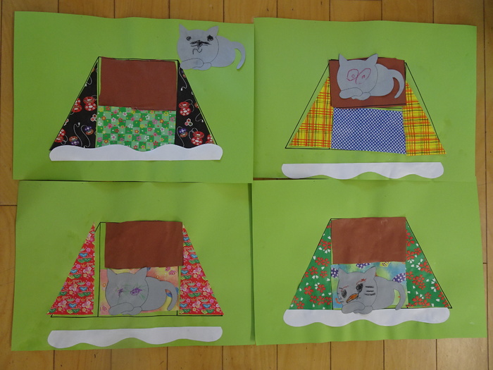 3歳児クラス:「こたつ」こたつの板を切り貼りました。子猫は好きな所に貼り、顔を描きました。猫の気持ちを聞くと眠いの。暑いの。等と教えてくれました。こたつを知らない子も知る機会となりました。