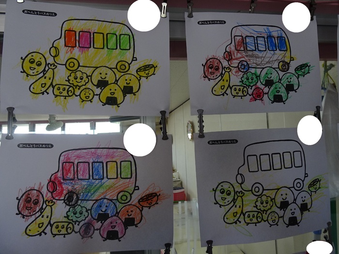 2歳児クラス:「おべんとうバス」表現遊びでおべんとうバスをやりました。終わってから塗り絵を楽しみました。