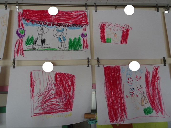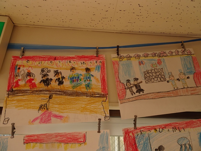 4歳児クラス:発表会でやった「おむすびころりん」を思い出して描きました。