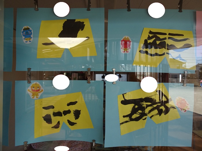 2歳児クラス:「鬼のパンツ」パンツの縞模様を絵具で塗りました。