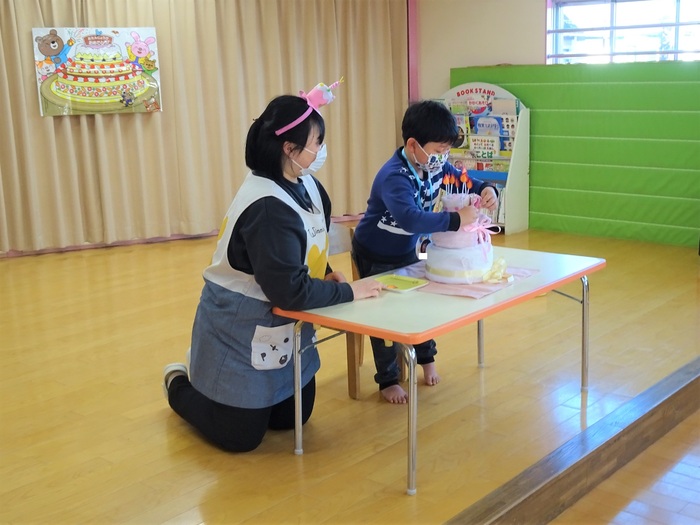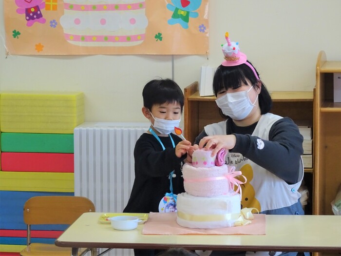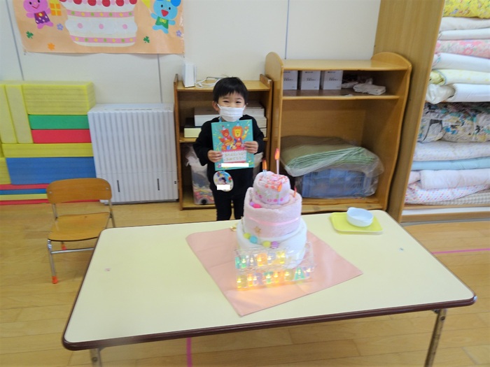 タオルケーキ作りをしました。自分の年の数だけろうそくをさしました。